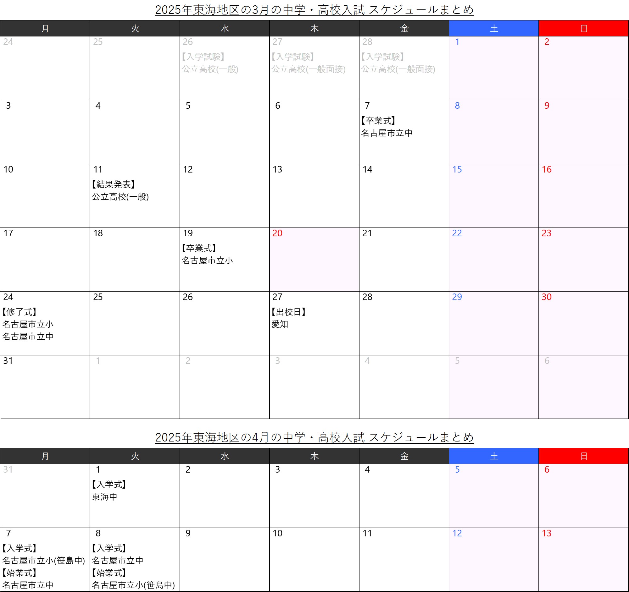 小学生・中学生の兄弟姉妹が居る場合は25日以降に計画する事になりますが、3月27日には愛知中の出校日、4月1日には東海中の入学式があるので、そこは覚えておいた方が良いと思います。