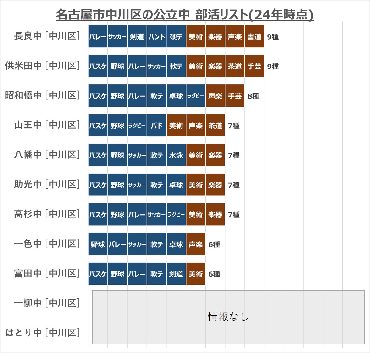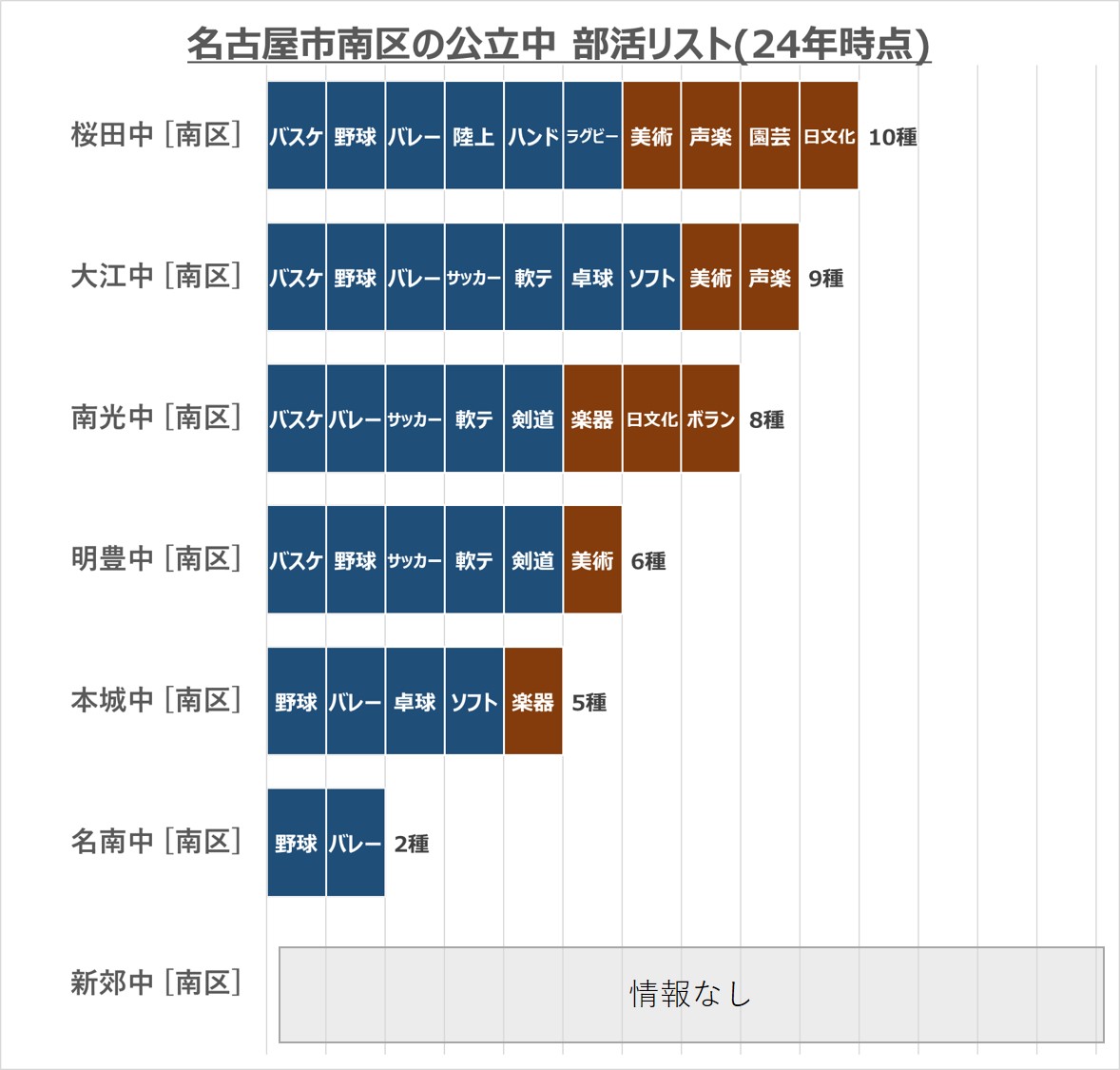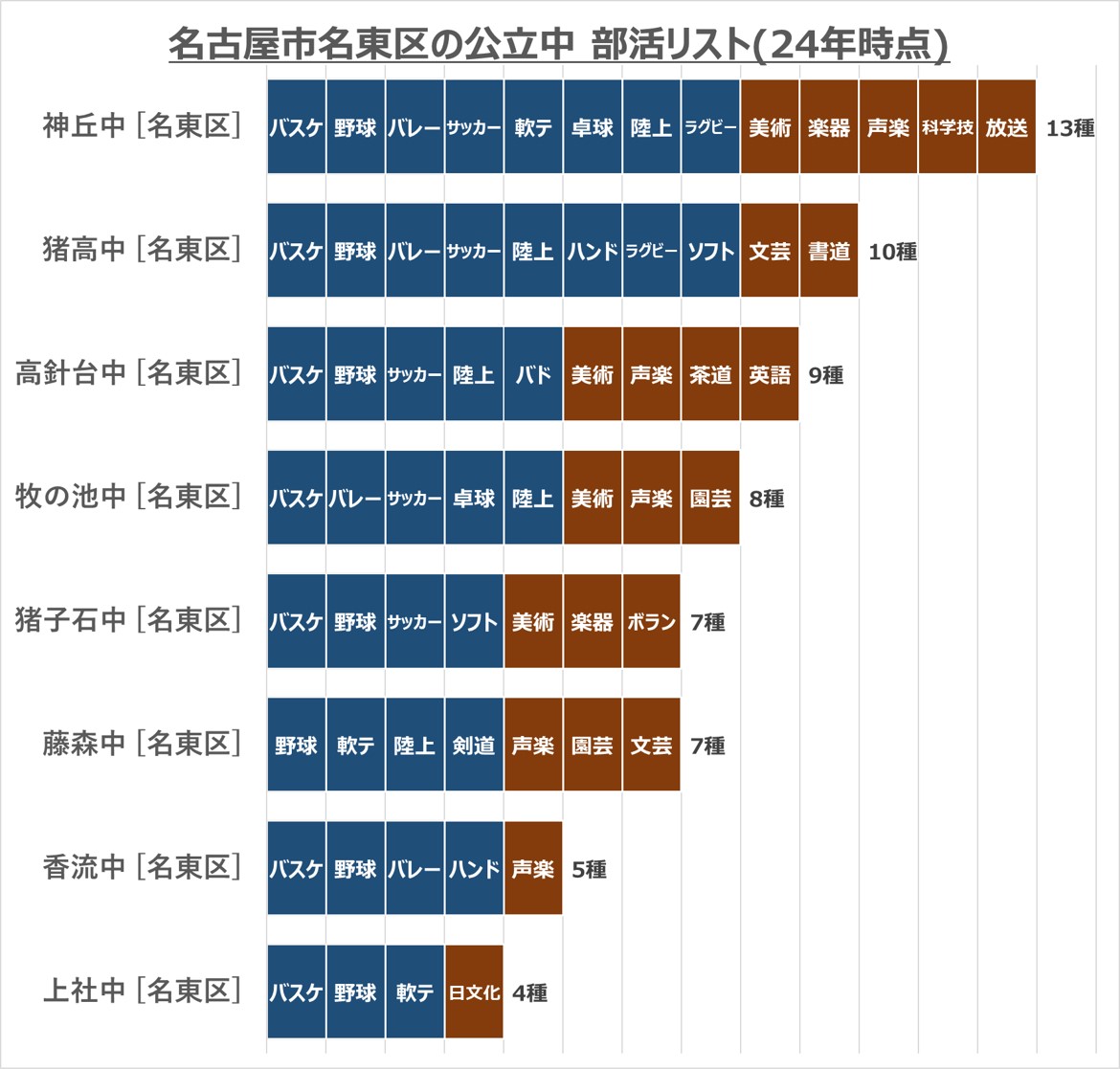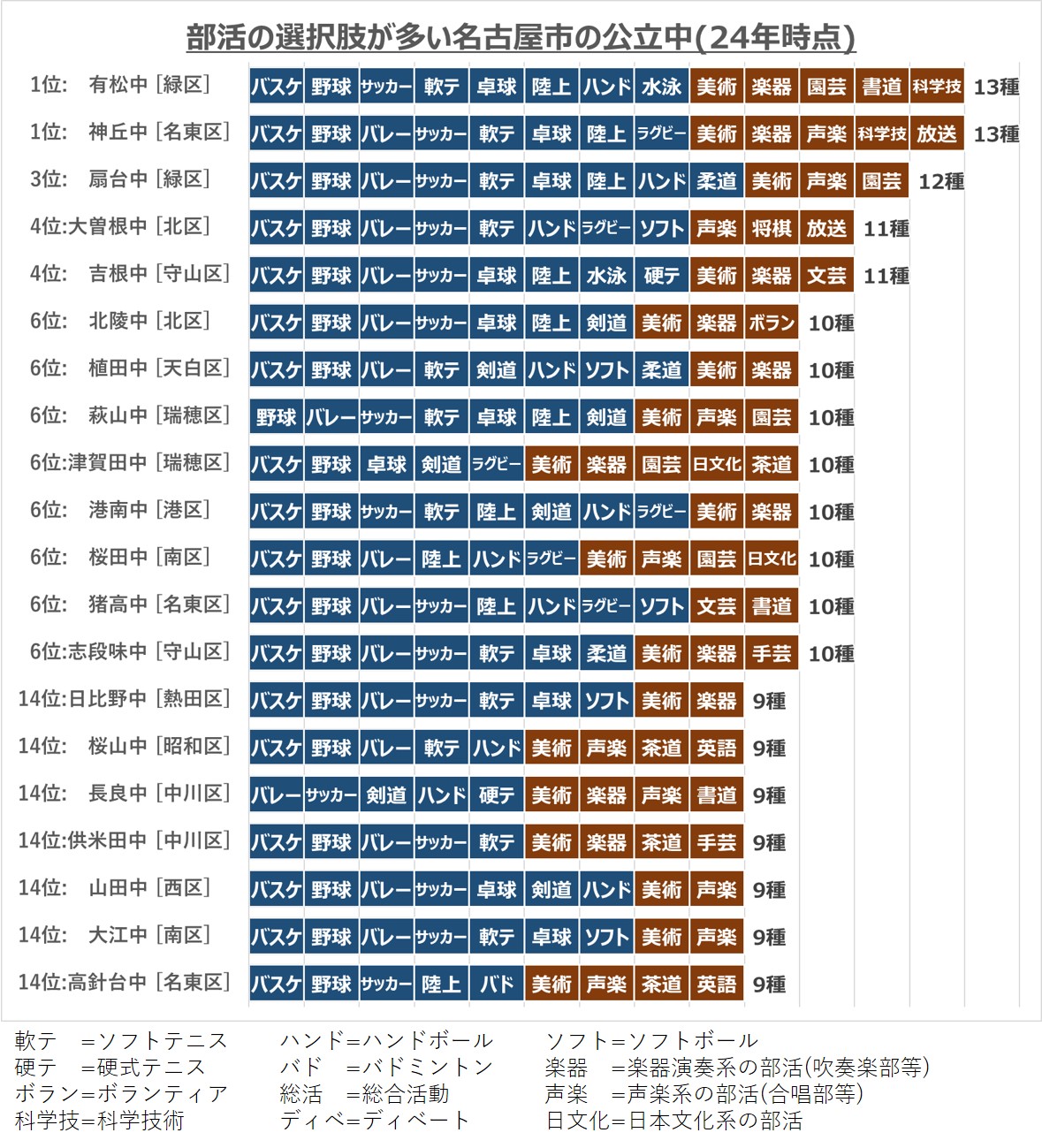 名古屋市の公立中で部活の選択肢が多いのはどこか?(24年データ)