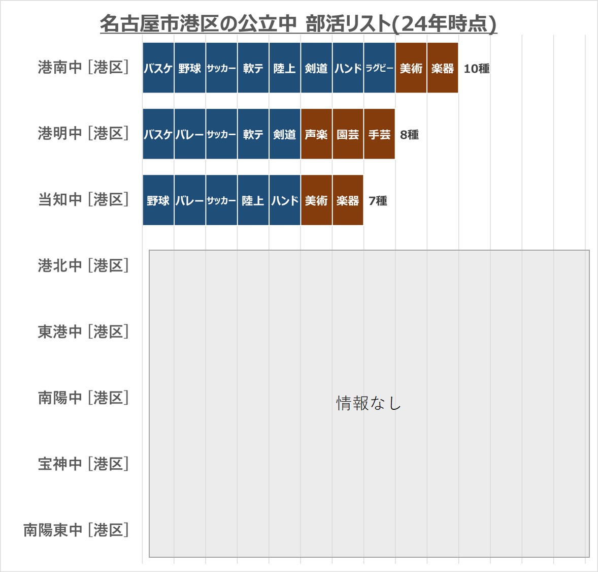 熱田区は学校数が少ないうえ、沢上中が”情報無し”だったため、部活情報が確認できたのは2校のみでした。