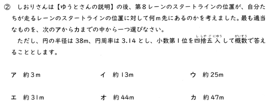 「しおりさんの走るレーンと、第1レーンのカーブ部分との半径差は3mである」