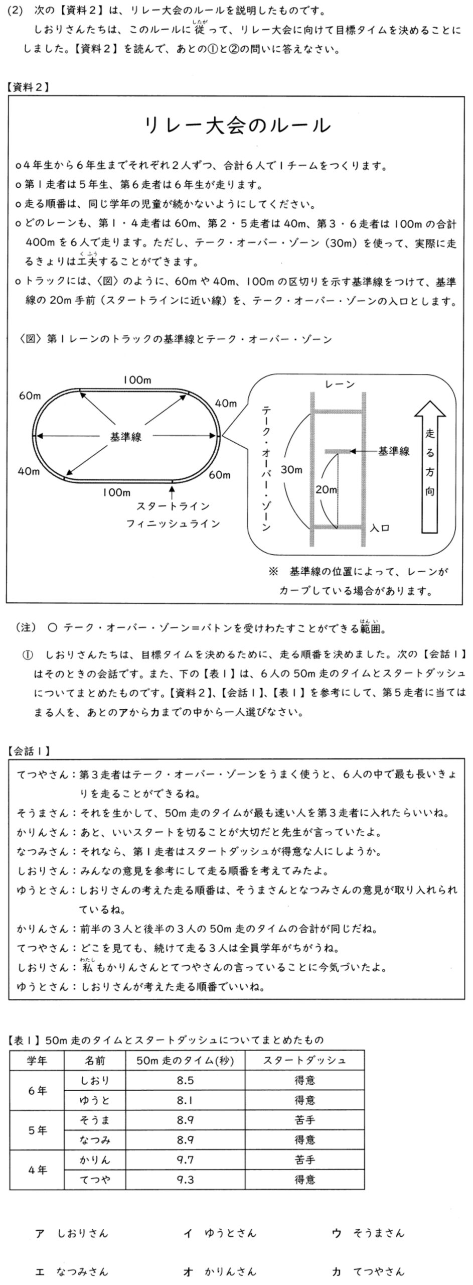 問題では、第5走が誰か問われているので、答えは「カ」となります。