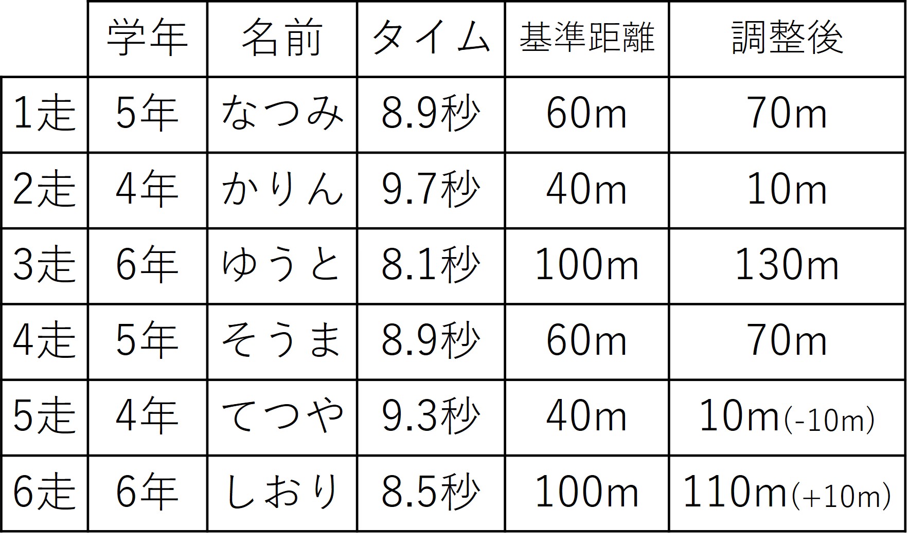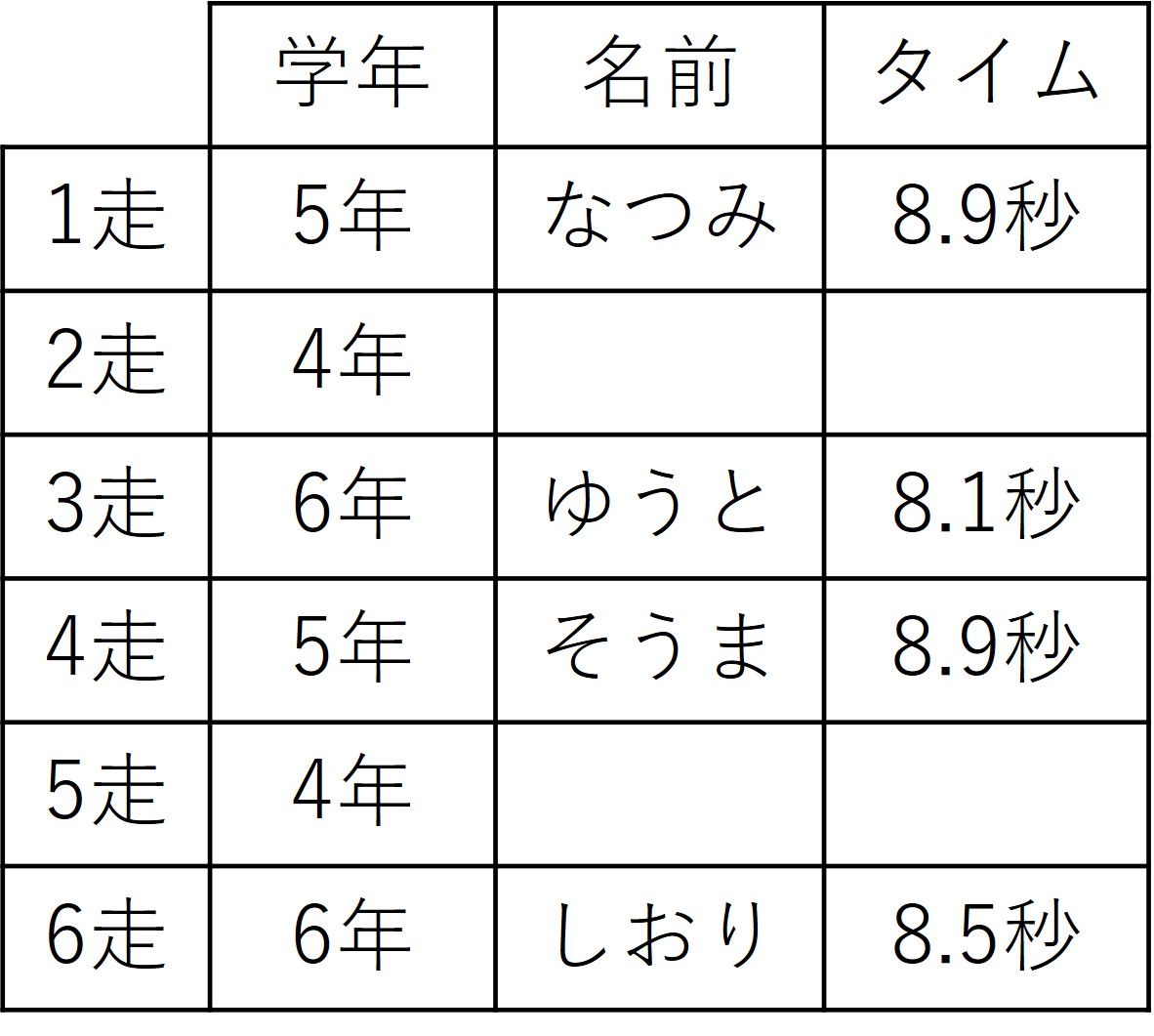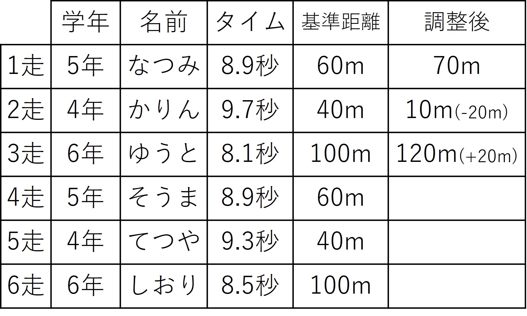※2走は5年も6年も入れないので4年生で確定、そうなると、4走には4年生は入れないので5年生が確定し、自動的に5走が4年生になる。