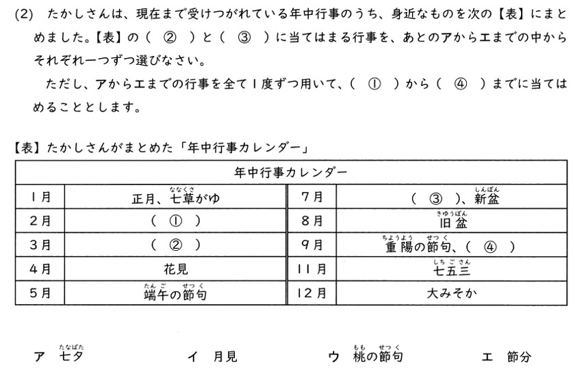 仮に”桃の節句”が分からなかったとしても、その他の選択肢が七夕・月見・節分なので、消去法でもイケるかも。