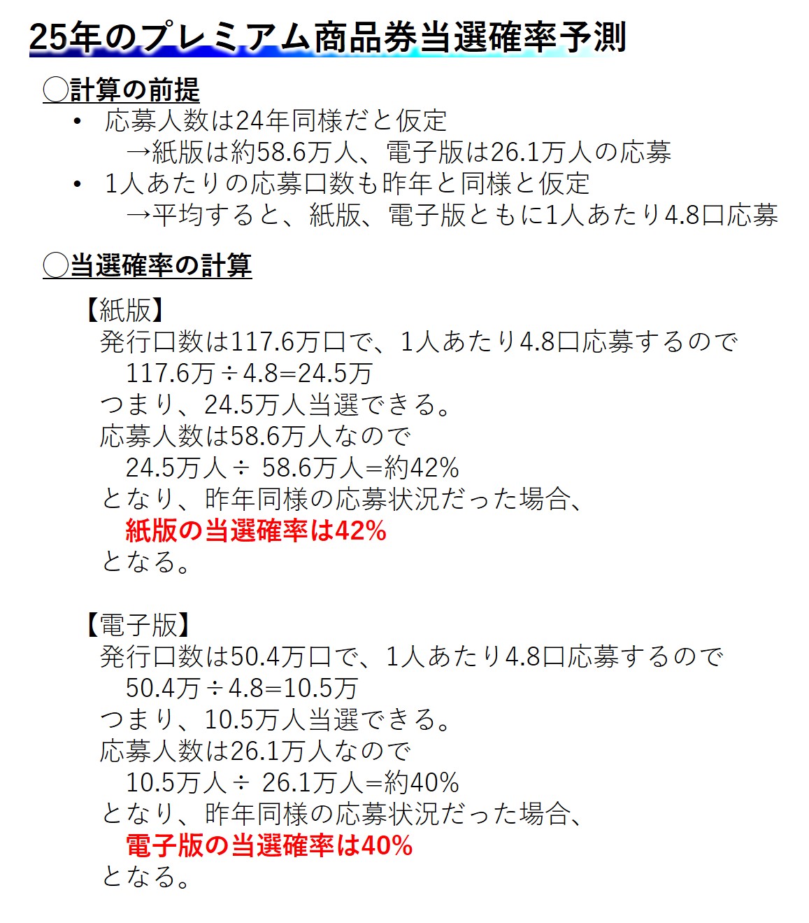 昨年は紙版・電子版ともに当選確率が60%前後だった事を考えると、大幅に当選確率が下がる事になります。