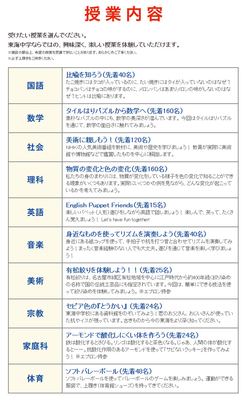 名古屋中は説明会の回数が多く、部活体験、体験授業に加え、夏には学校探検も同時開催されるなど、受験生も楽しめる内容になっています。