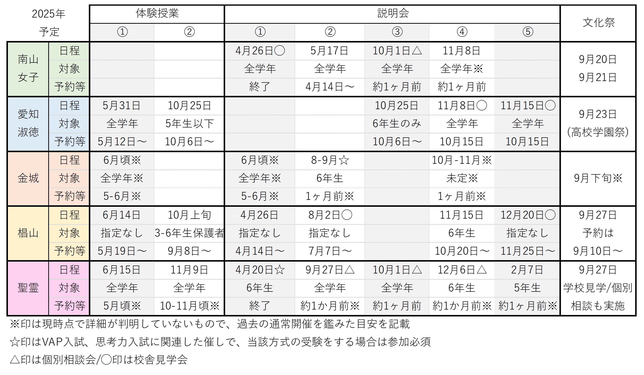 2025年における名古屋の私立中説明会・体験授業・文化祭の予定 女子校編