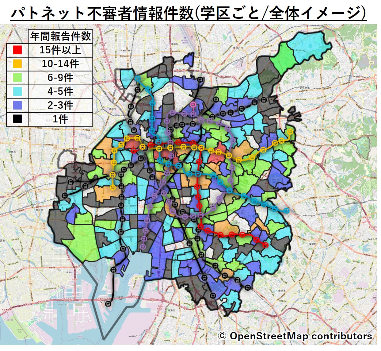 なお、今回は”学区”単位の分析を行っていますが、学区が混在している町丁目で確認された不審者情報に関しては、混在学区全てで発生したものとしてカウントしています。