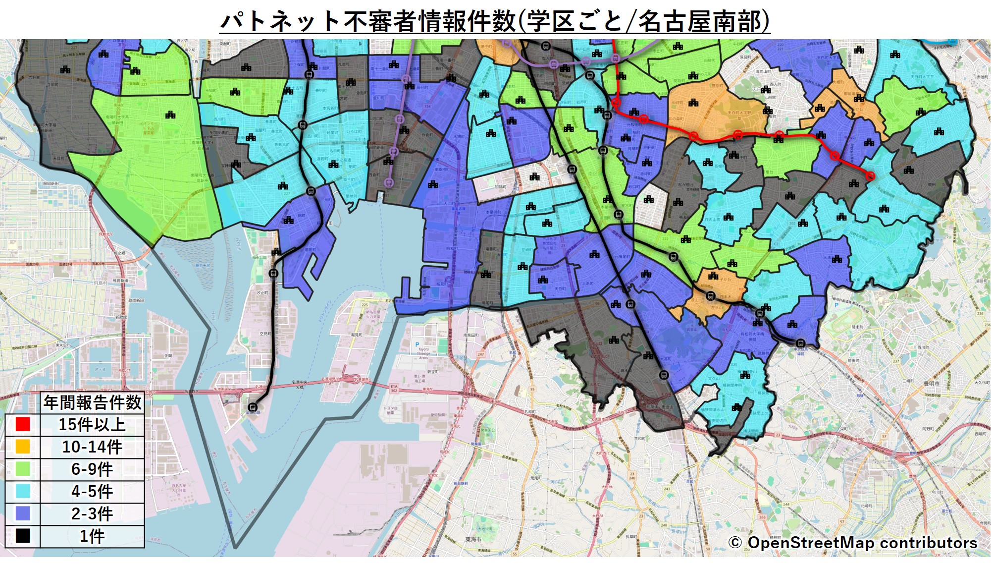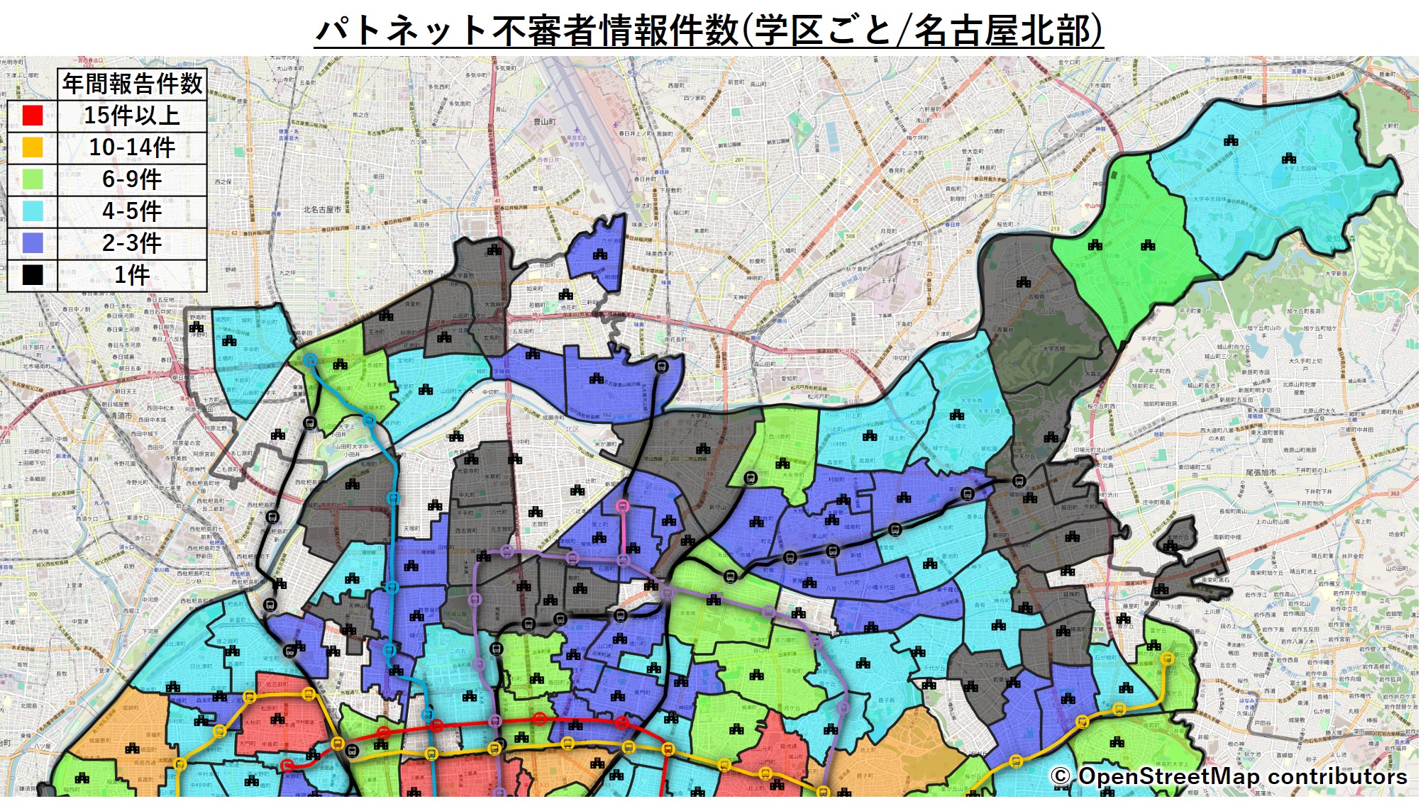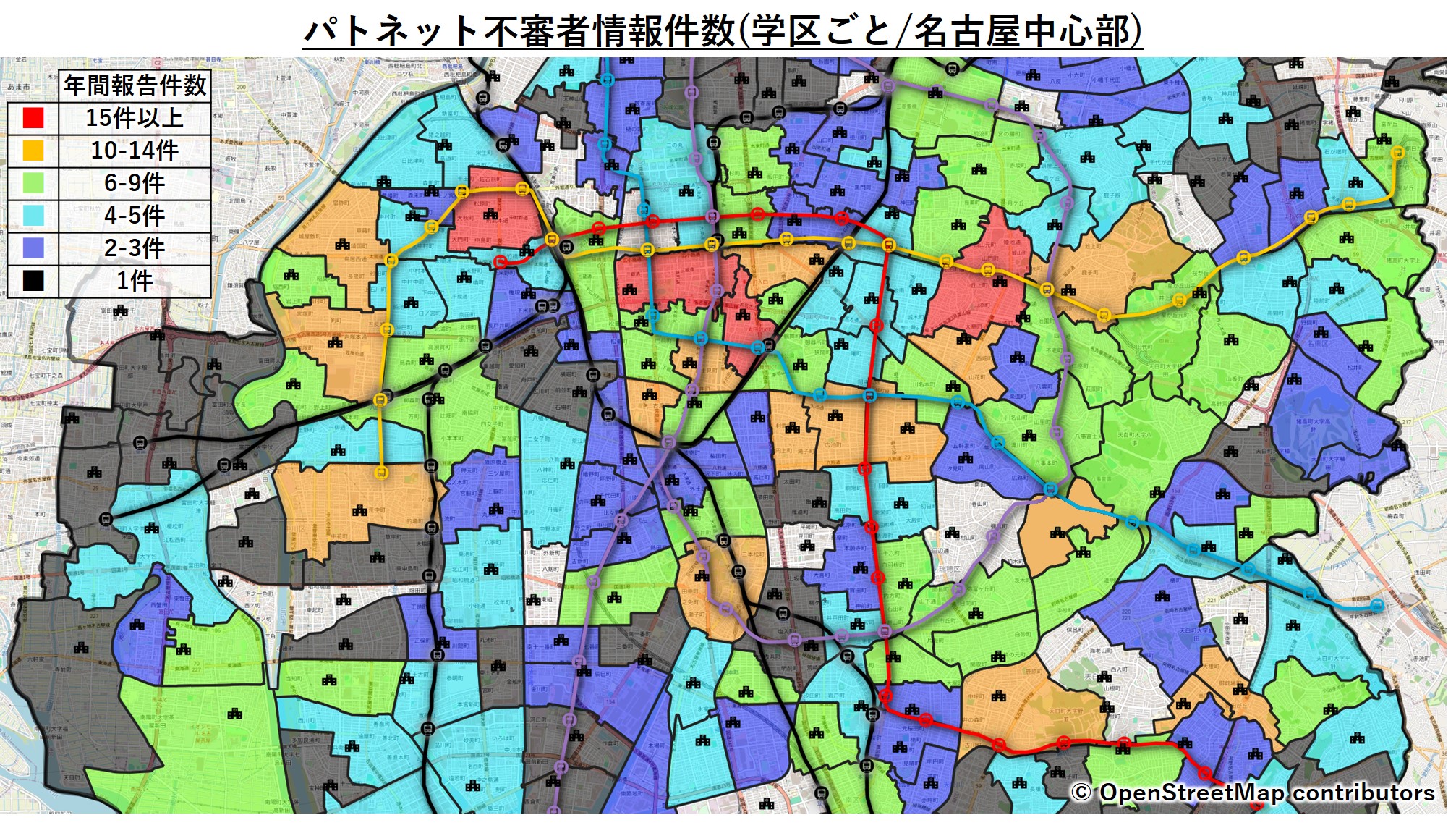 やはりどちらかと言うと、東山線沿線&繁華街が近い学区の報告件数が多いです。