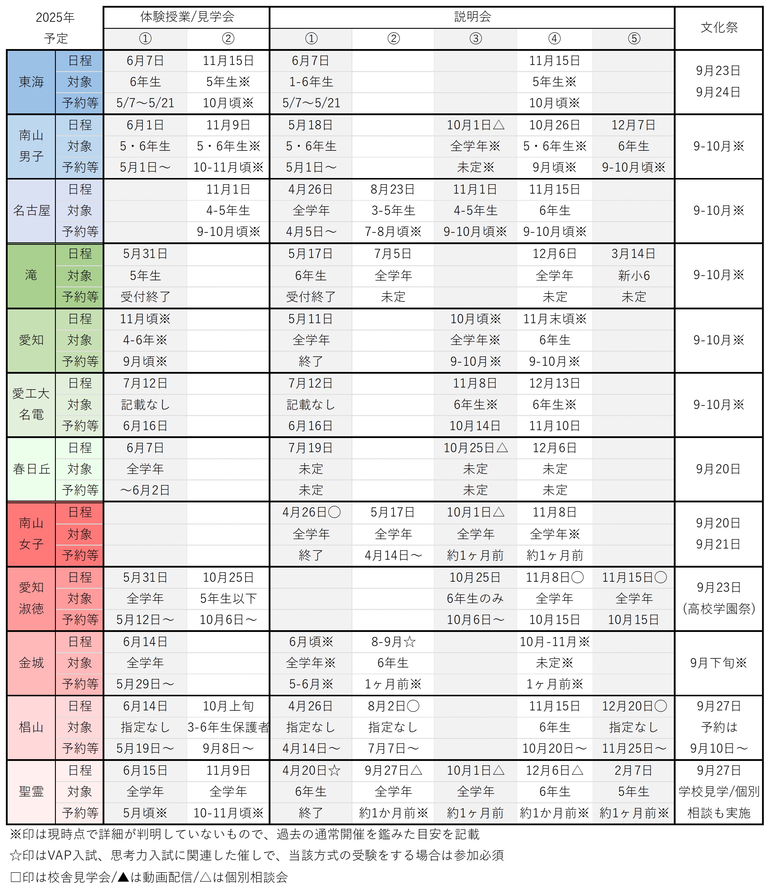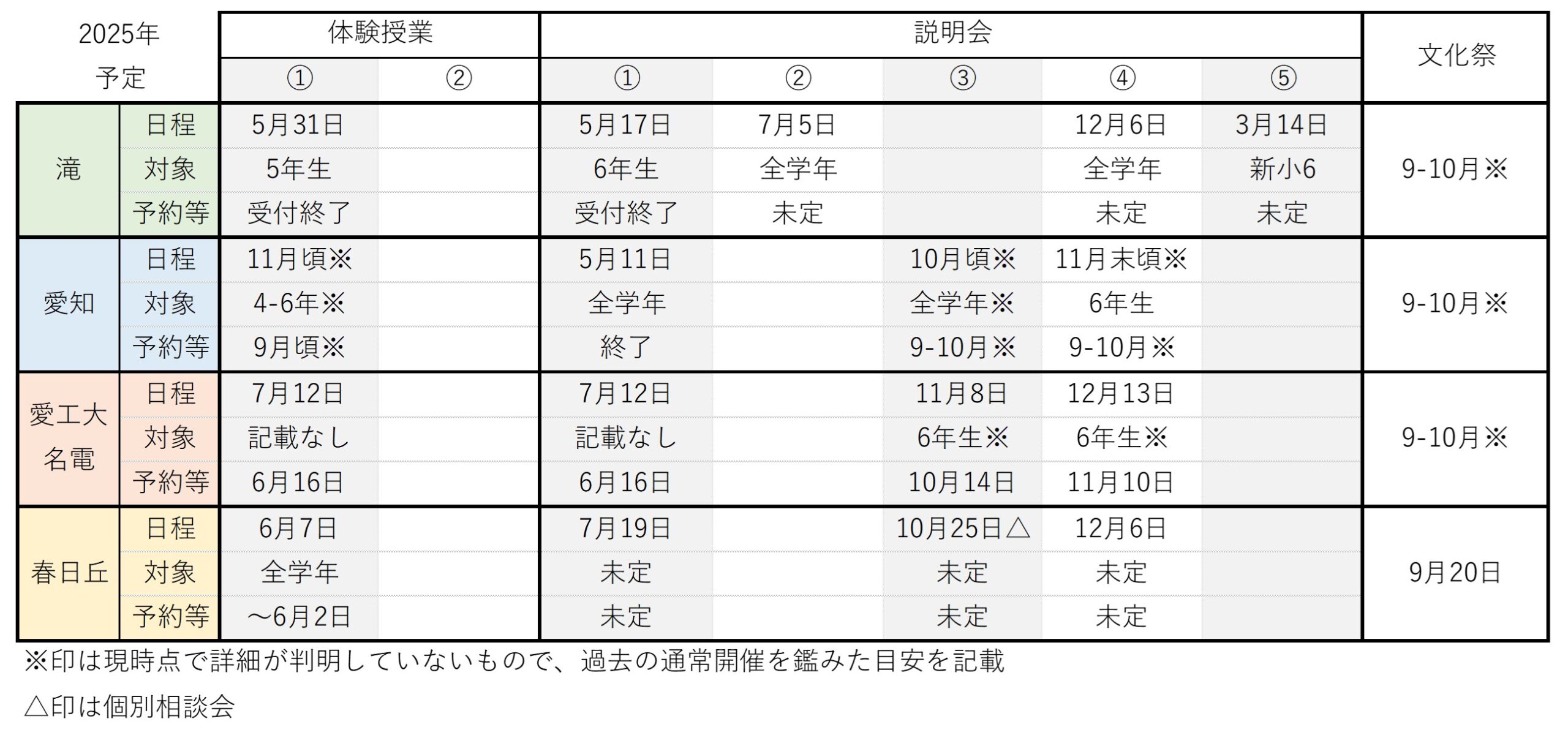 2025年における名古屋の私立中説明会・体験授業・文化祭の予定 共学校編+まとめ