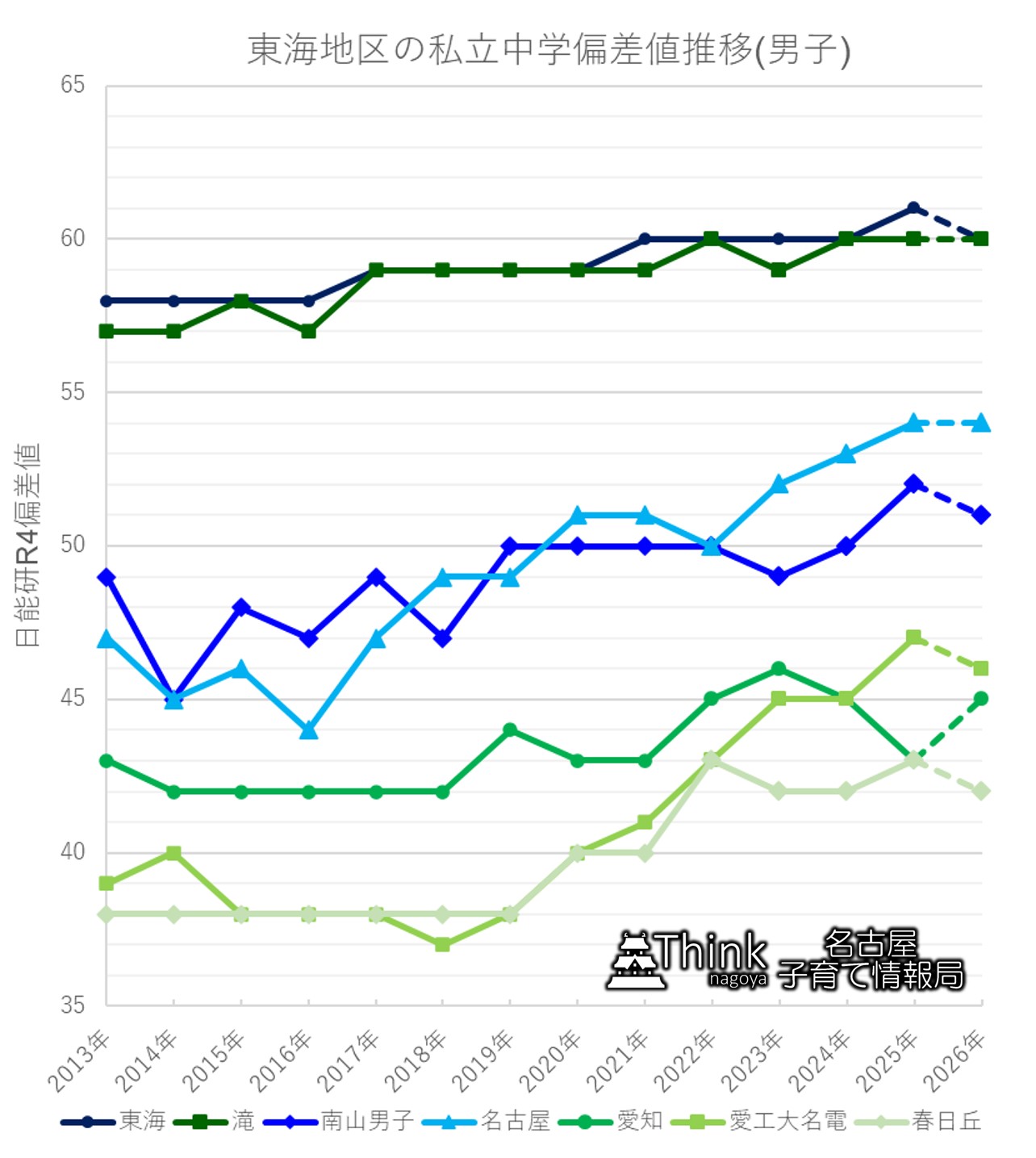 2026年の予想R4偏差値でもその傾向は変わらず、「愛知中よりも名電中の方が難しい」というのが定着しつつあるようです。