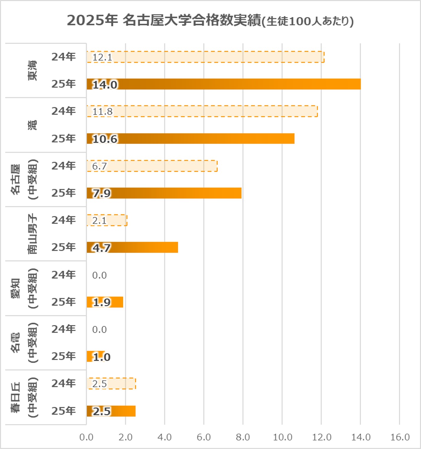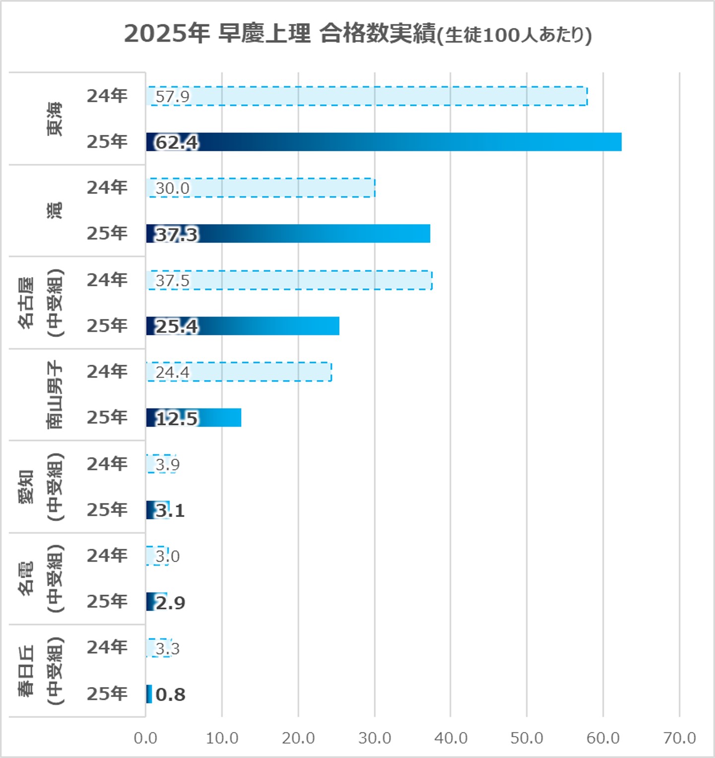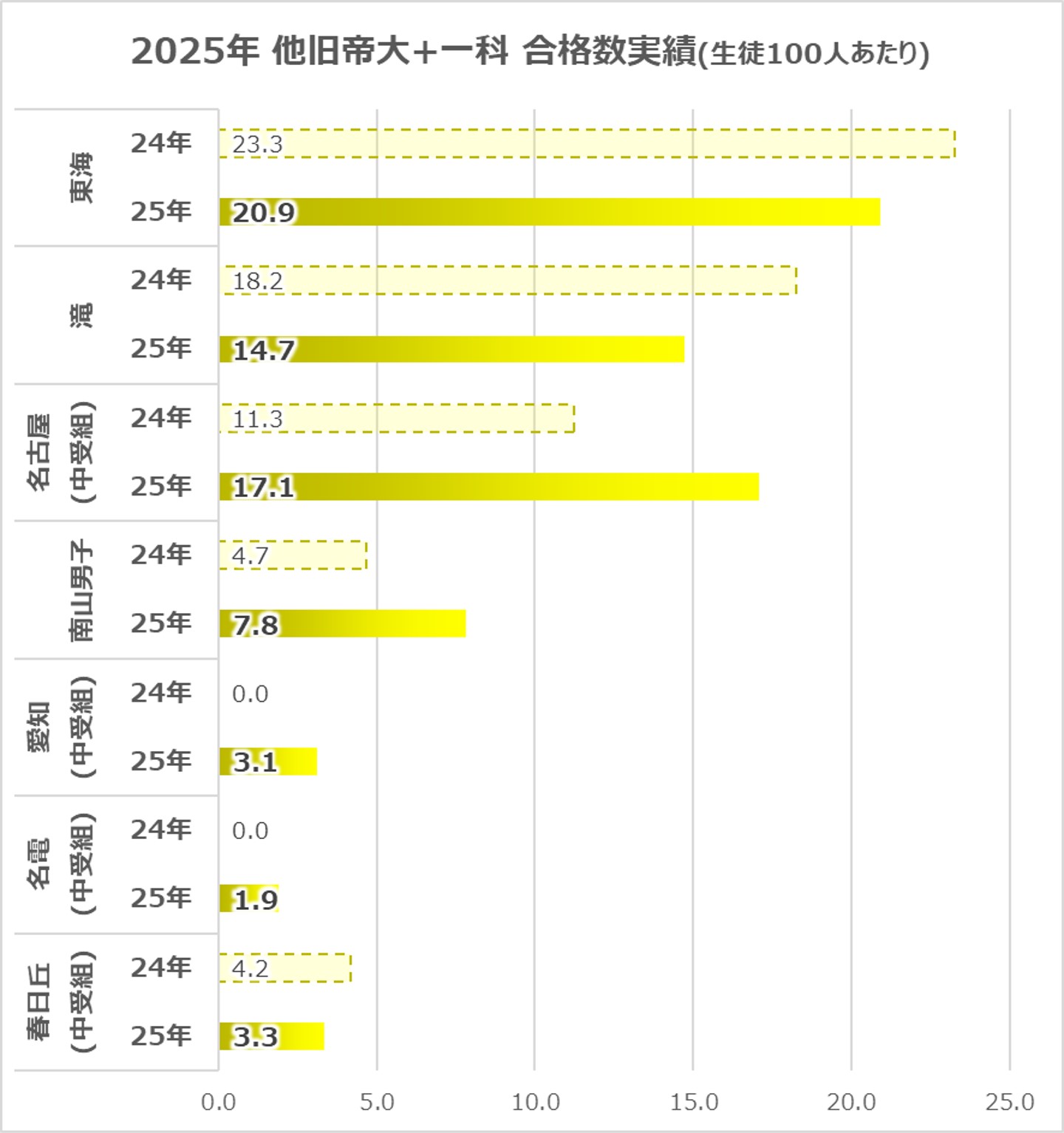 また、春日丘は絶対数は多くないものの、同偏差値帯どころか、名古屋中・南山男子以上の結果を残しているのが印象的。