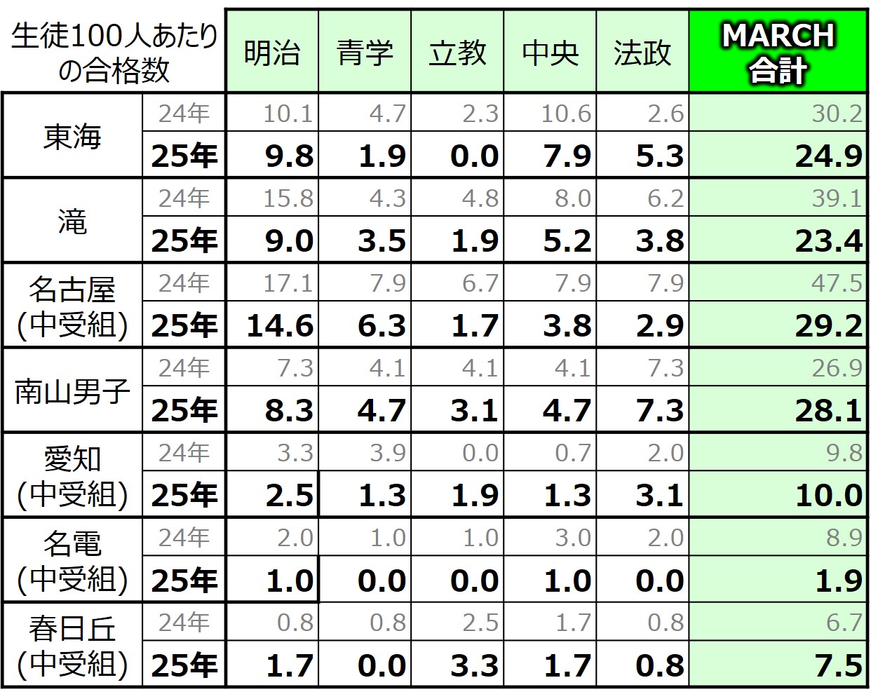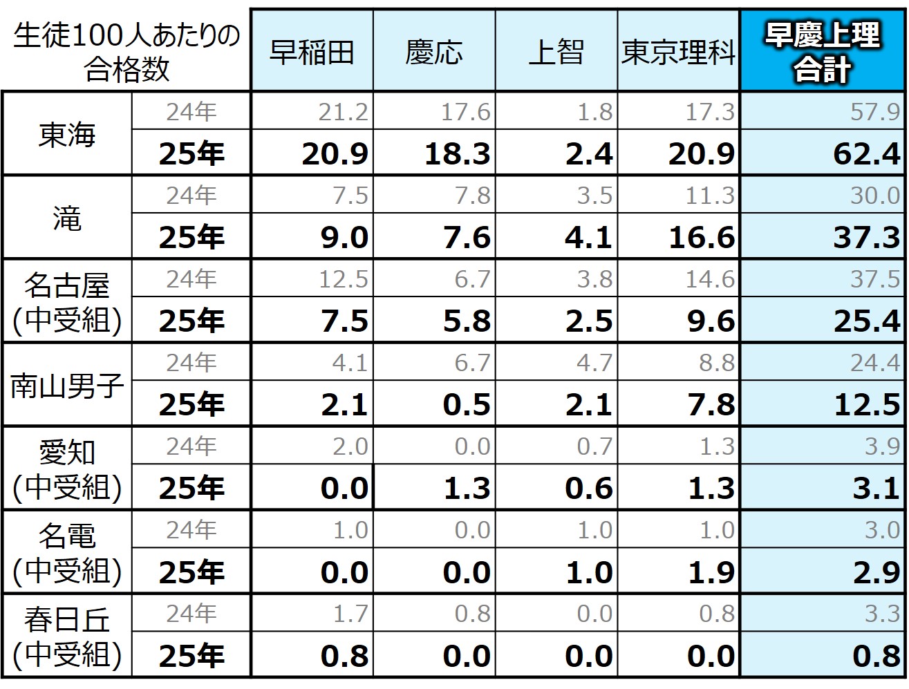 昨年は名古屋が滝を越えた早慶上理でしたが、今年は滝が数字を伸ばし、名古屋が数字を落としたため、滝が2位の座を奪還した形になりました。