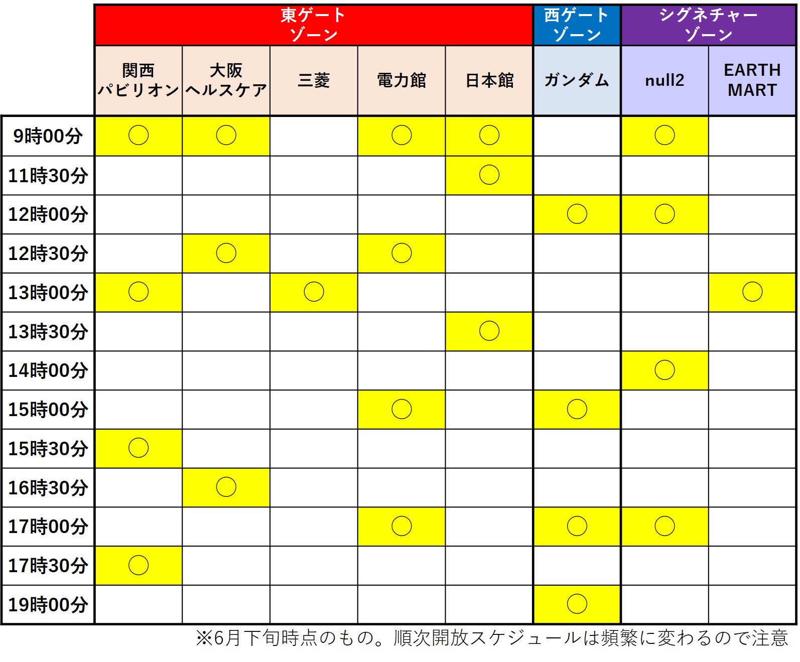 6月下旬時点では以下の通り、当日枠が順次開放されていくパビリオンもありますが、これも早いもの勝ち&枠が少ないので3人以上だとかなりハードルが上がります。