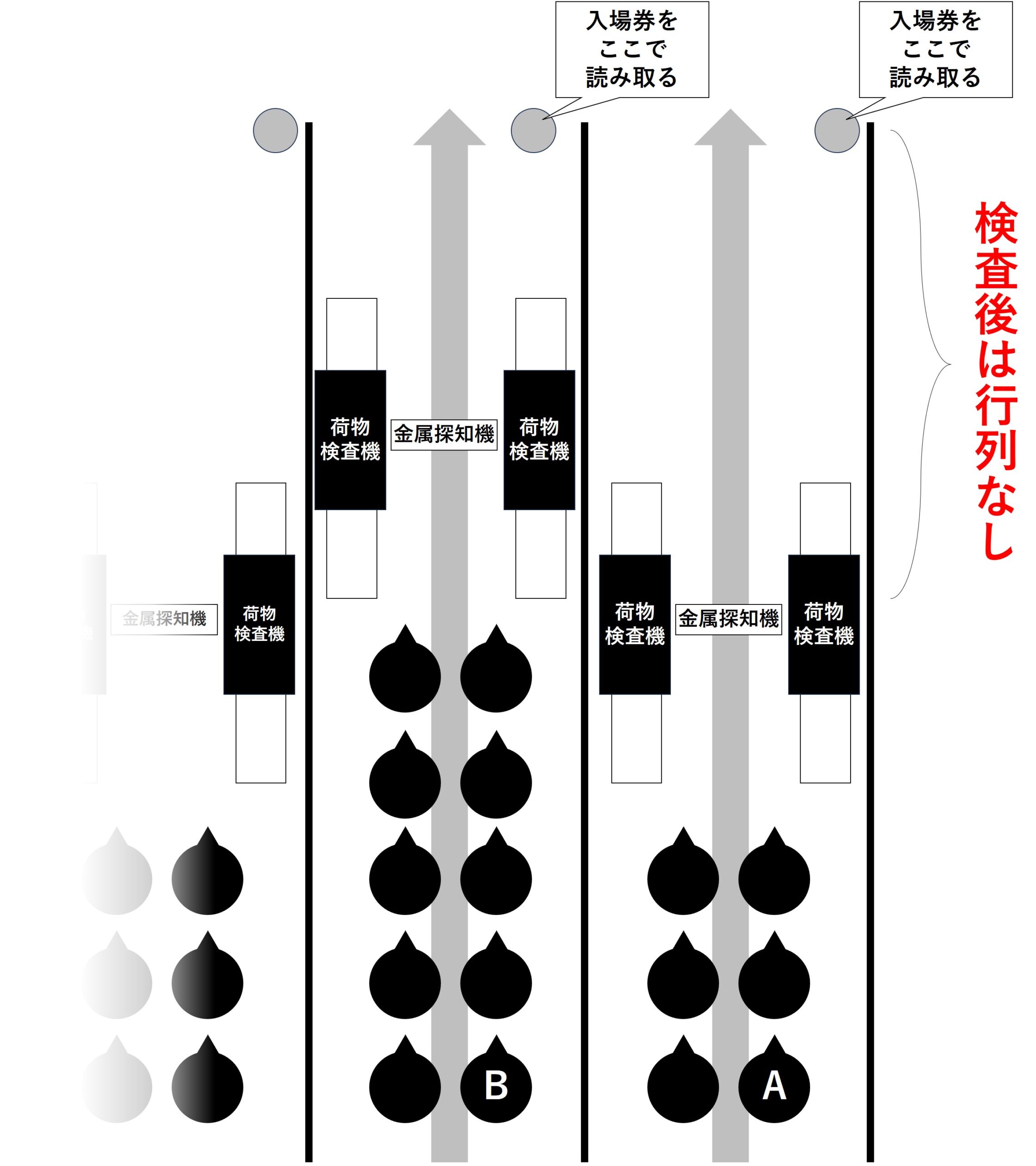混みすぎていて写真が撮れなかったのですが、イメージ的には以下のような感じで、荷物検査の場所が前後しており、明らかに手前で荷物検査をしている列の方が早く入場できます。