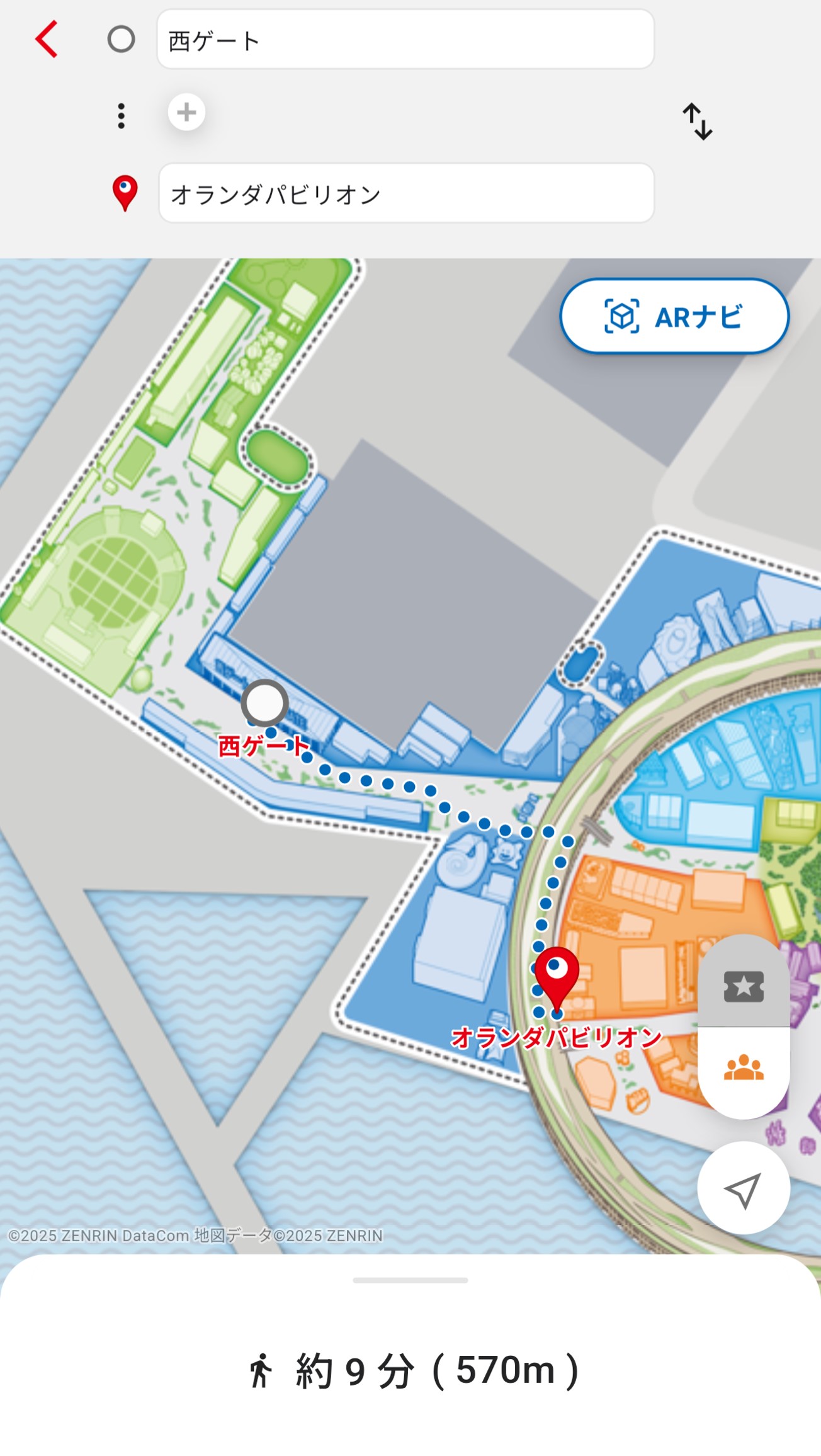 Personal Agentアプリは現在地がすぐに分かるうえ、パビリオン検索をすれば目的のパビリオンの位置、距離、所要時間、最適ルートも案内してくれるので紙のマップよりも素早く移動できます。