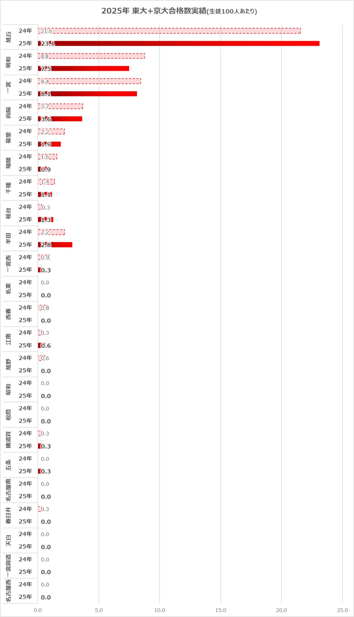 やはり愛知県の公立高校では、旭丘、明和、一宮の3校が強く、特に旭丘はダントツの実績ですね。