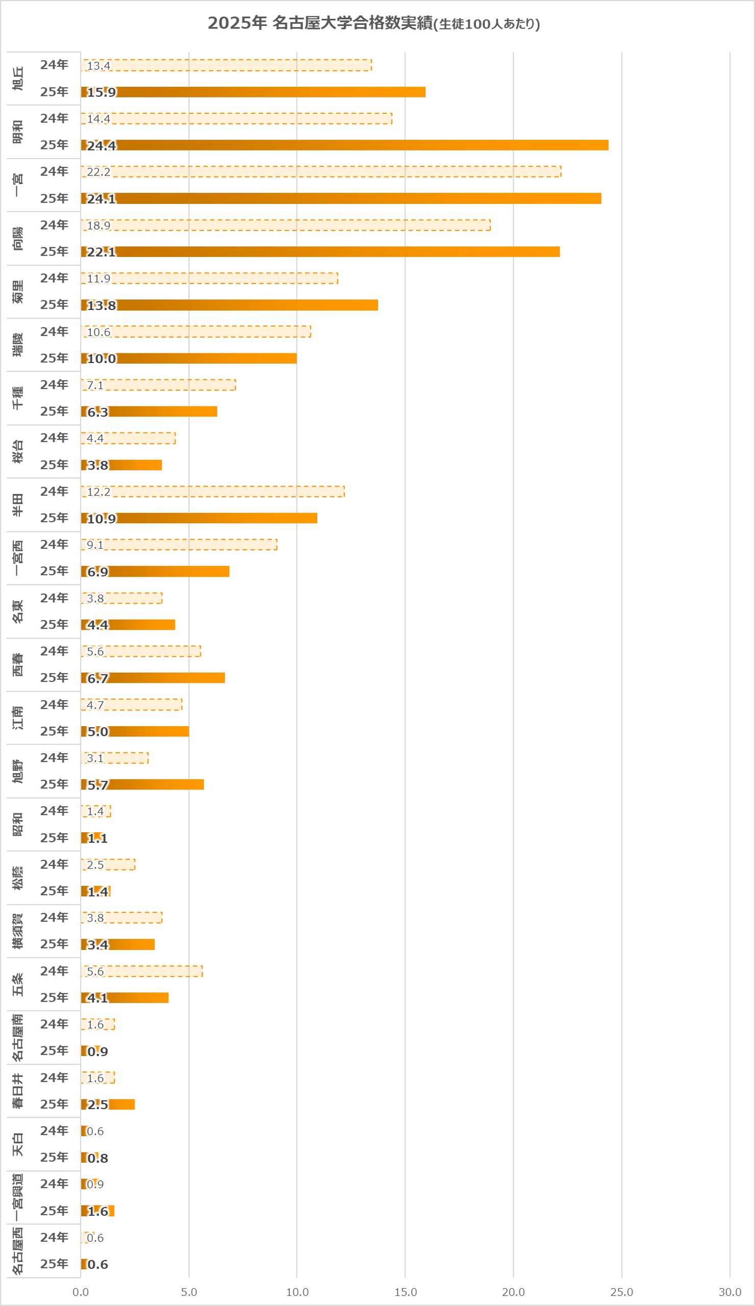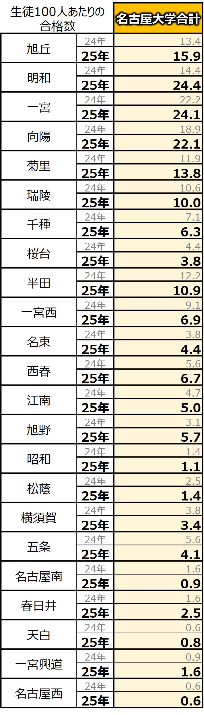 名古屋大学は東大・京大が強かった3校に加え、向陽高校も強さを見せており、菊里高校や半田高校、瑞陵高校も100人あたりの合格数が10人を超えており、良好な結果となっています。