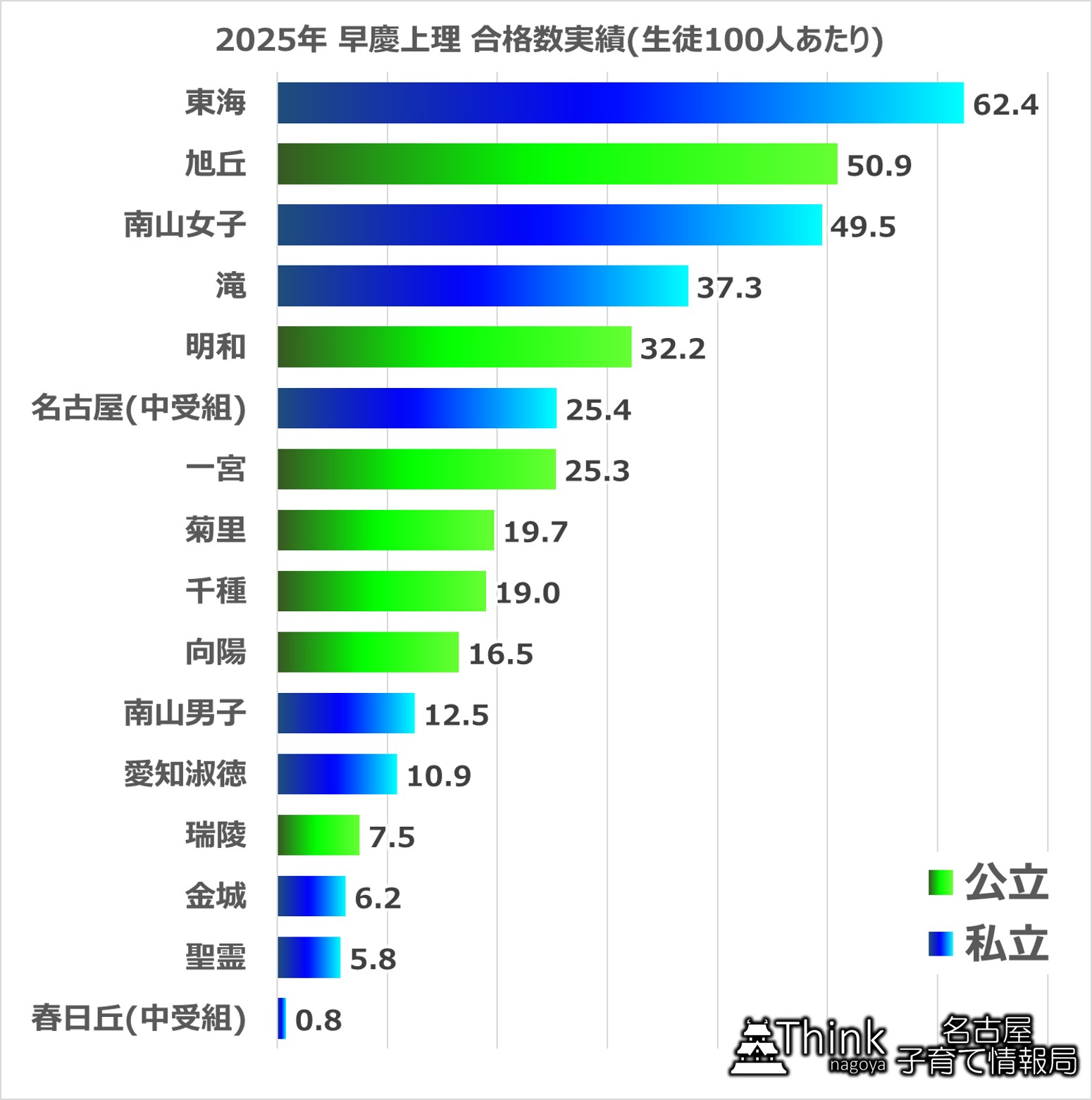 私立・公立の比較をすると、基本的には南山女子・東海・滝・名古屋あたりは公立上位校と同等かそれ以上の実績を残していますが、それ以下の私立校は苦戦している状況です。