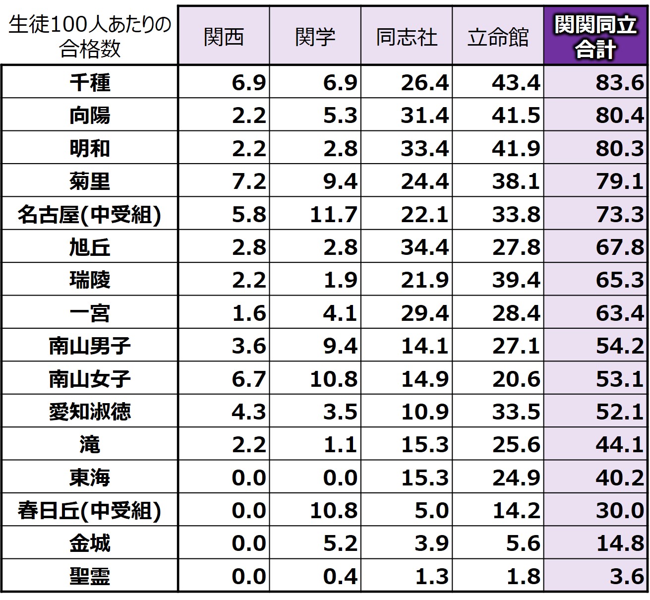 - 100人あたりの数字を算出するベースとなる卒業生の数は、詳細な人数が不明のため、各校の”普通科”の募集人数としている