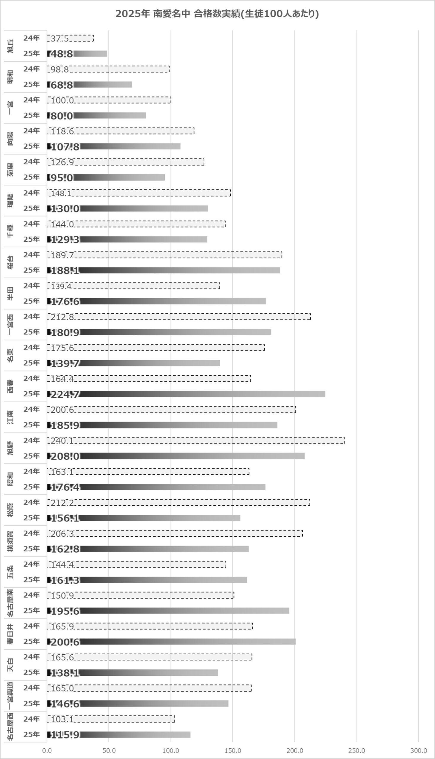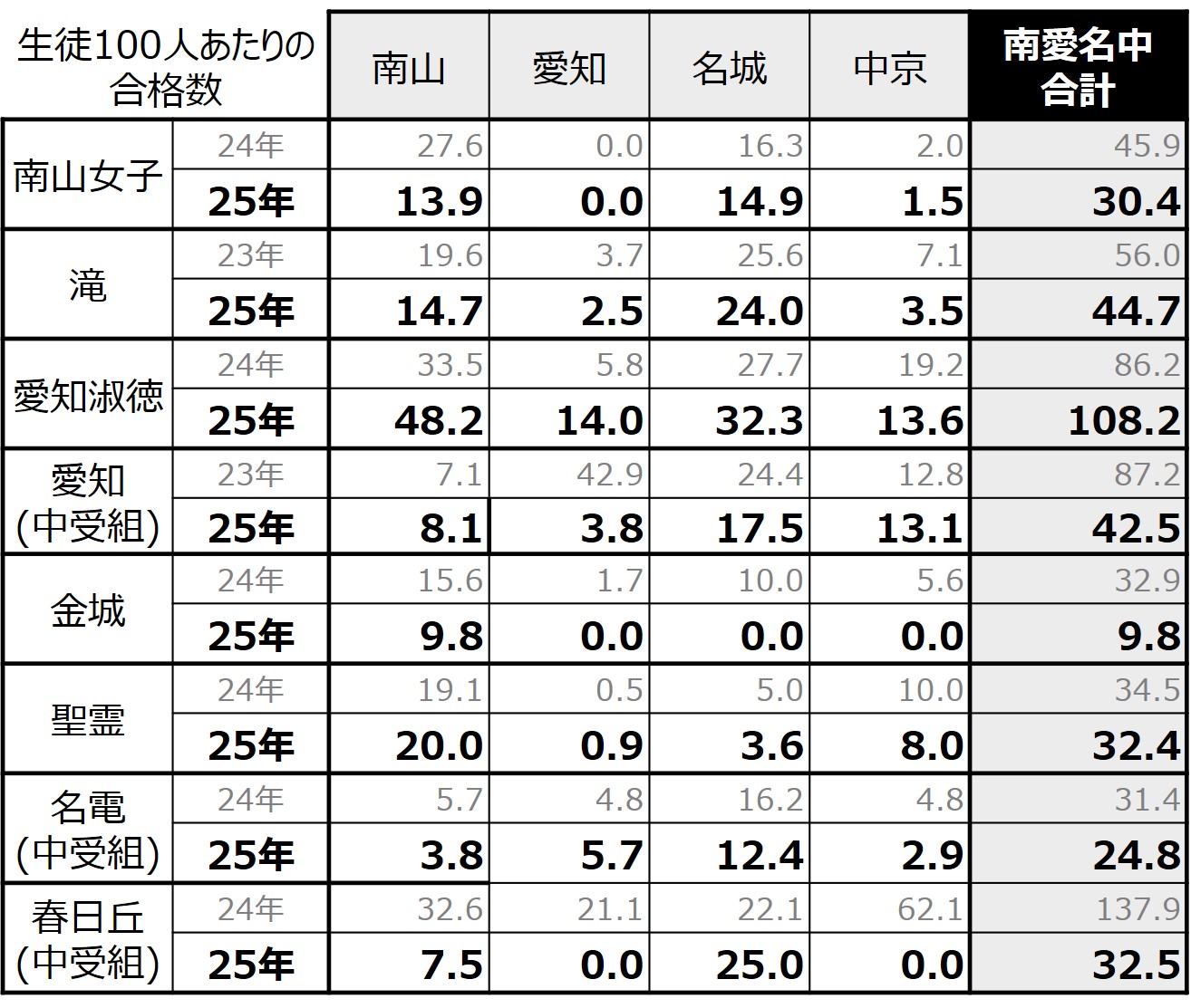 私立中高一貫校の男子校+共学校の南愛名中の合格実績は以下の通り。