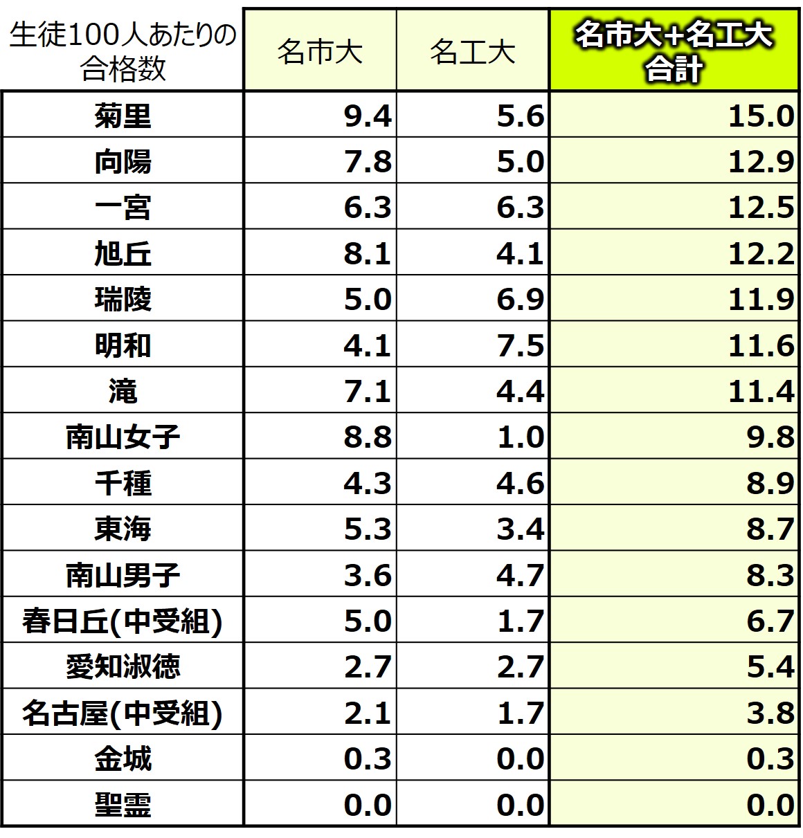 向陽・菊里・桜台の名市大実績が良いのは、名市大に”学校推薦型選抜入試 名古屋市高大接続型”という枠がある影響も考えられますね。