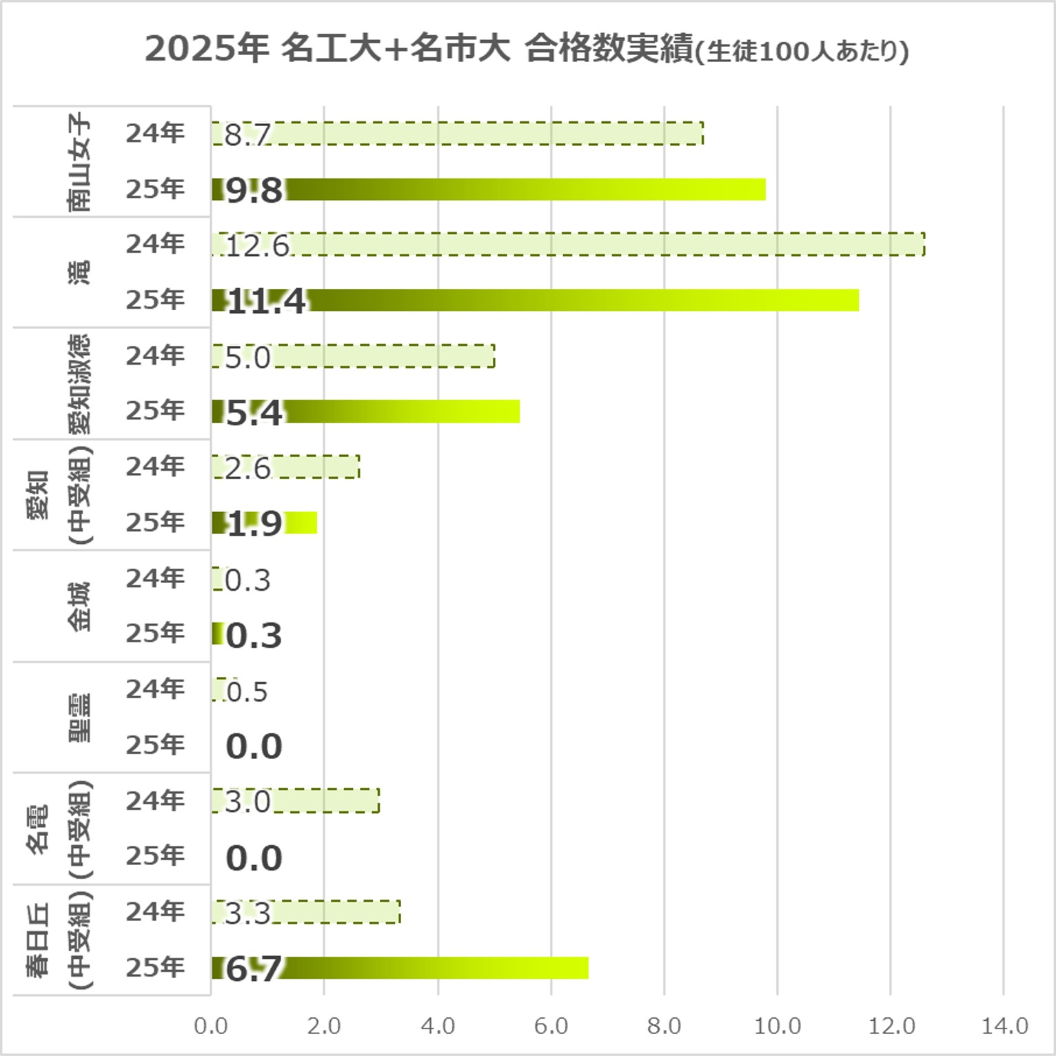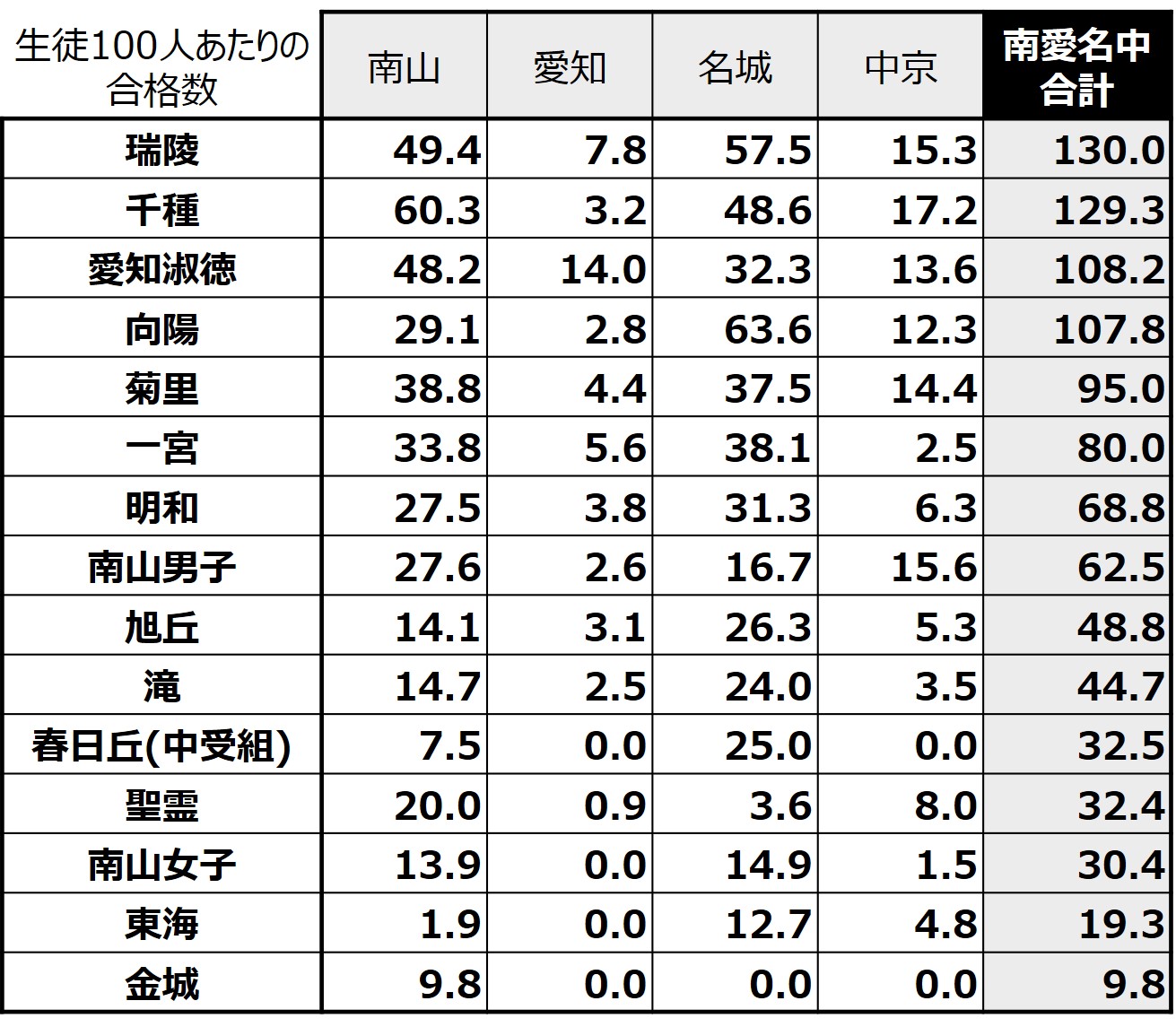 生徒100人あたりの合格数で上位公立高校と同等なのは南山女子と滝のみで、この2校とその他の学校では大きな差があります。