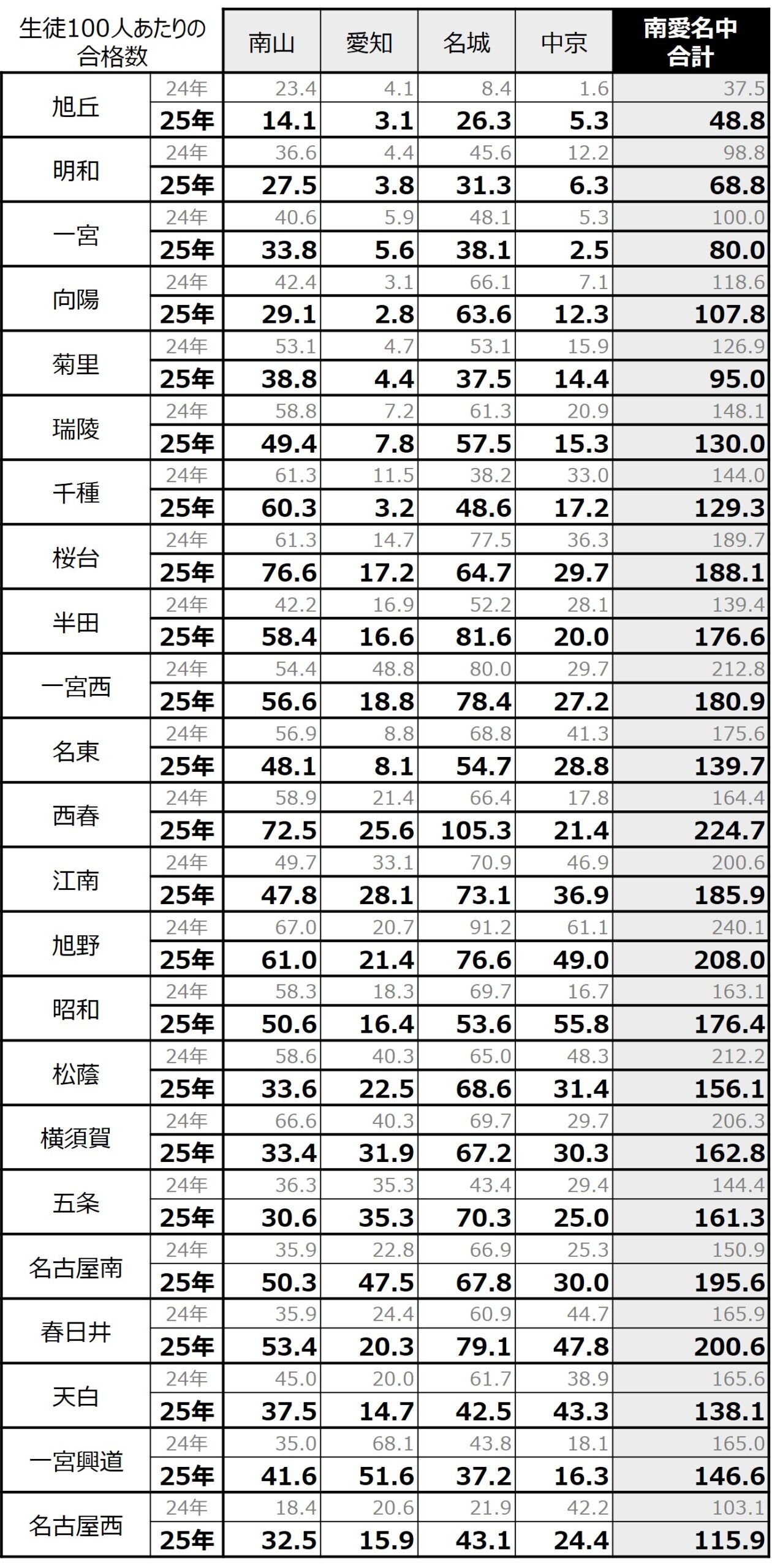 なお、名古屋中は実績を落としていますが、今年は名古屋大の実績が良かったので、単純にそちらに受験生が流れたという良い変化である可能性が高そうです。