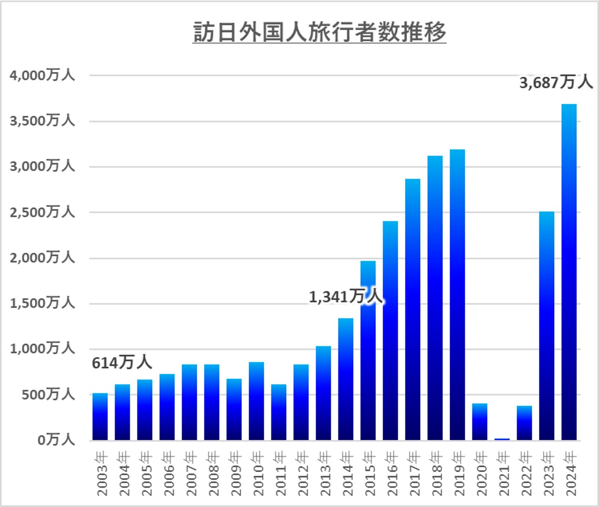 以下の図の通り、ここ数年はすっかり外国人観光客数も回復し、24年には過去最高の人数を記録しています。