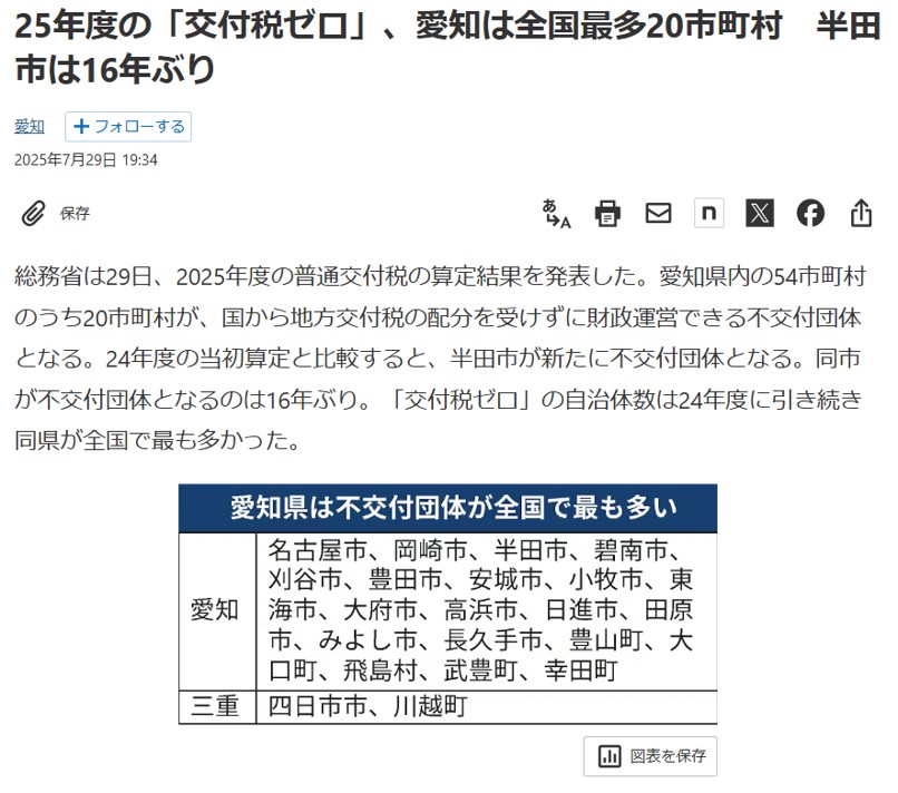 また、名古屋市およびその周辺は国から地方交付税の配分を受けずに財政運営できる”不交付団体”が多く、”観光客で稼がなくても充分潤っている自治体である”と解釈することもできます。