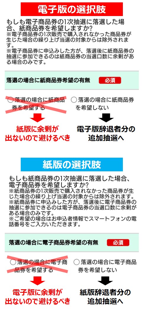 今回は紙版・電子版ともに申込率が100%を超えているので無意味なうえ、左の選択肢を選ぶと辞退者が出て追加抽選が行われる際に追加抽選対象外となります。