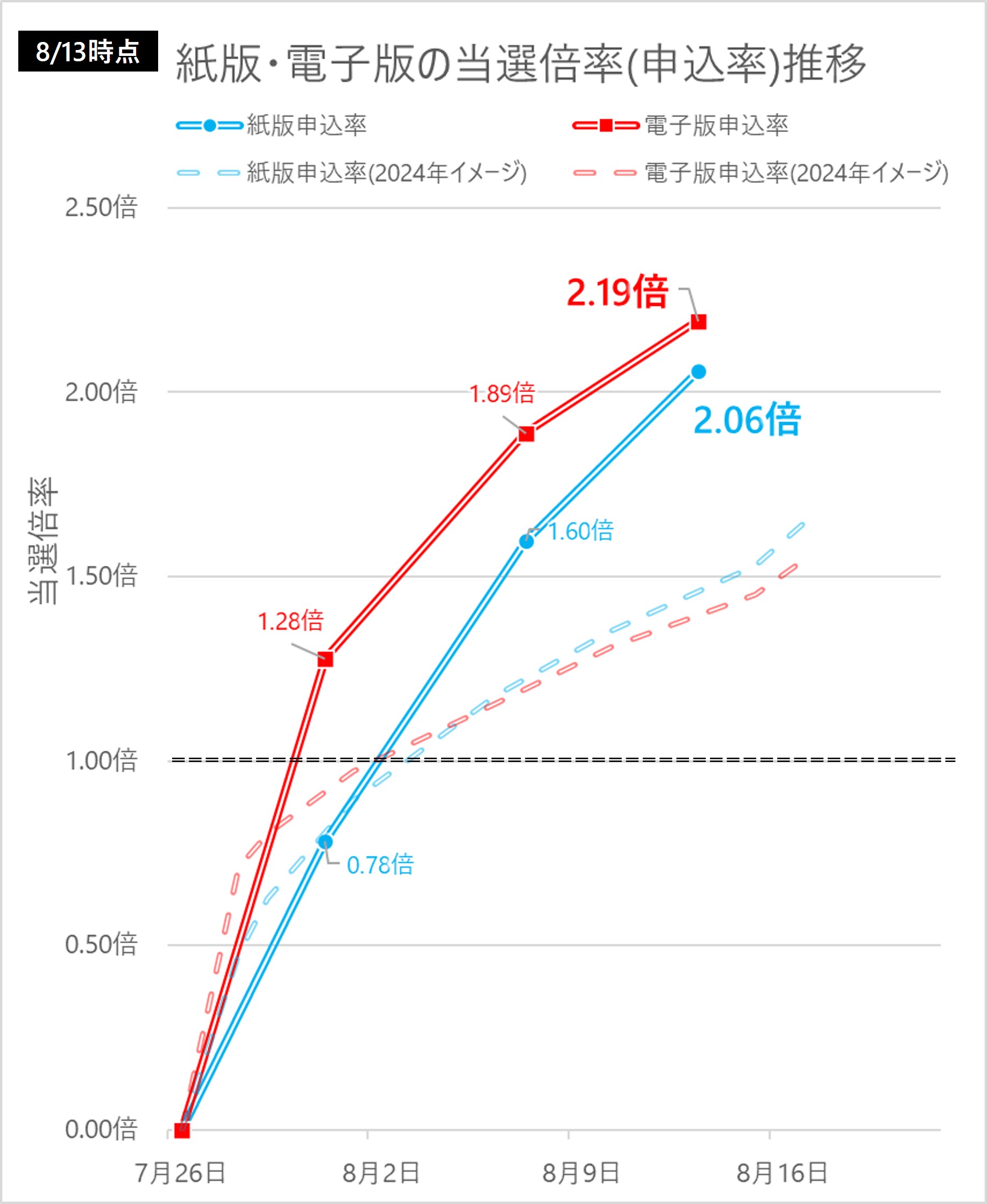 当選確率の逆転が起こっていますが、これは例年紙版の最終盤の駆け込み申込数が多いからで、今年も似たような傾向になると思います。