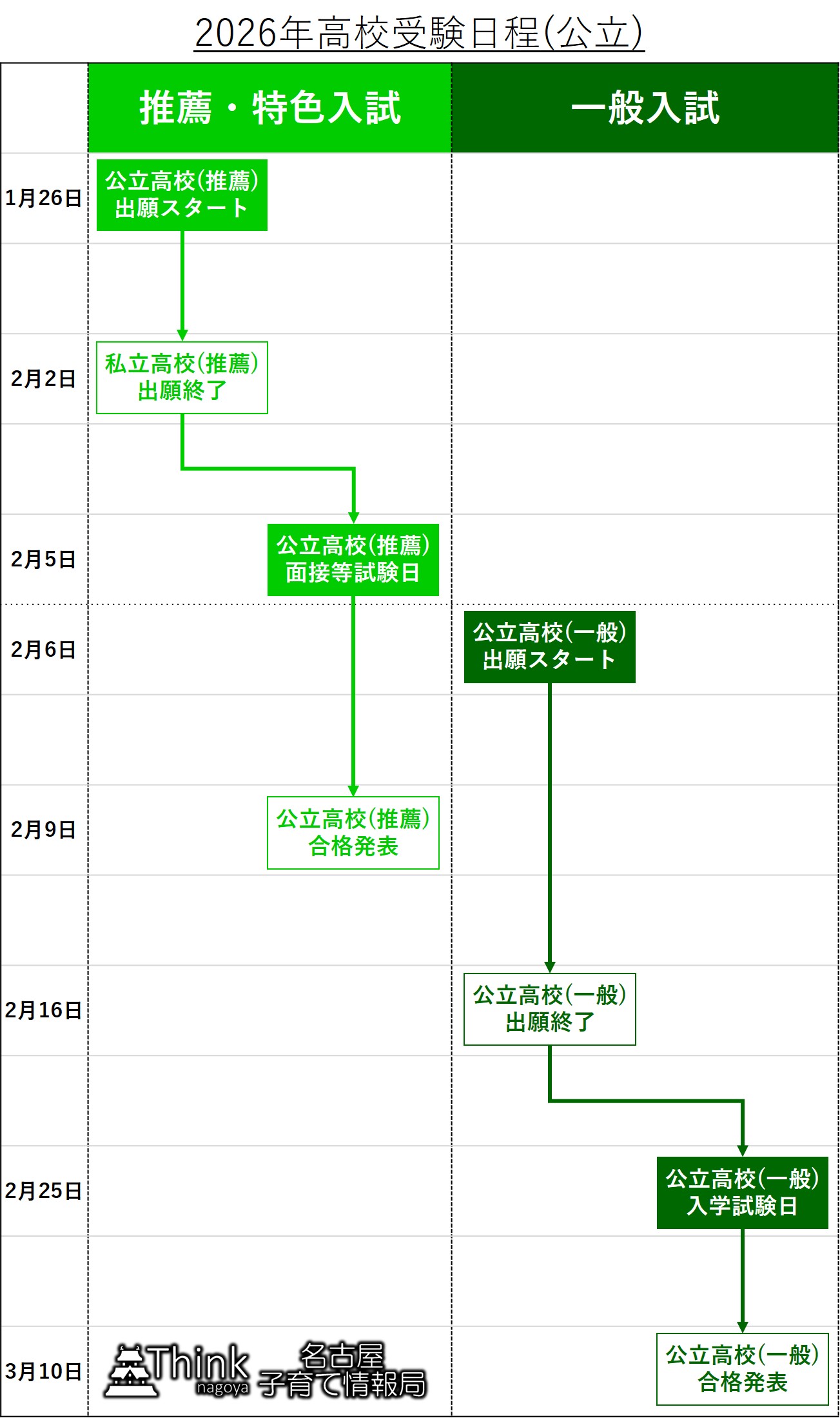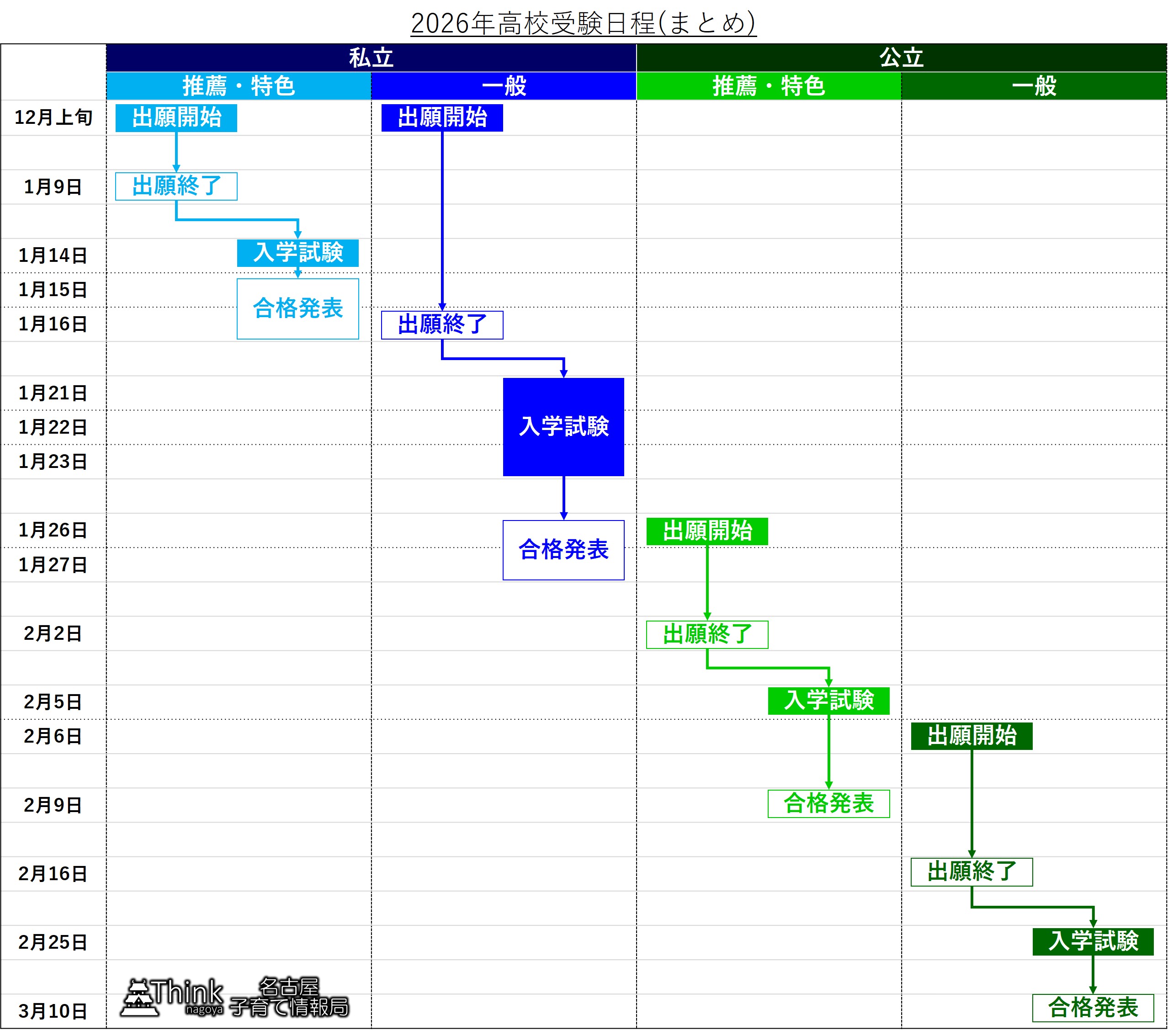 以上を全てまとめると、2026年版の愛知県高校入試スケジュールは以下のようになります。