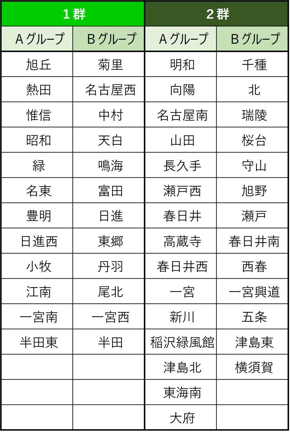 尾張地区の場合、学校群(1群・2群)を選択→Aグループから1校・Bグループから1校という感じで2校の志望校を選んでいくわけですが、各群とグループ分けは以下のようになっています。