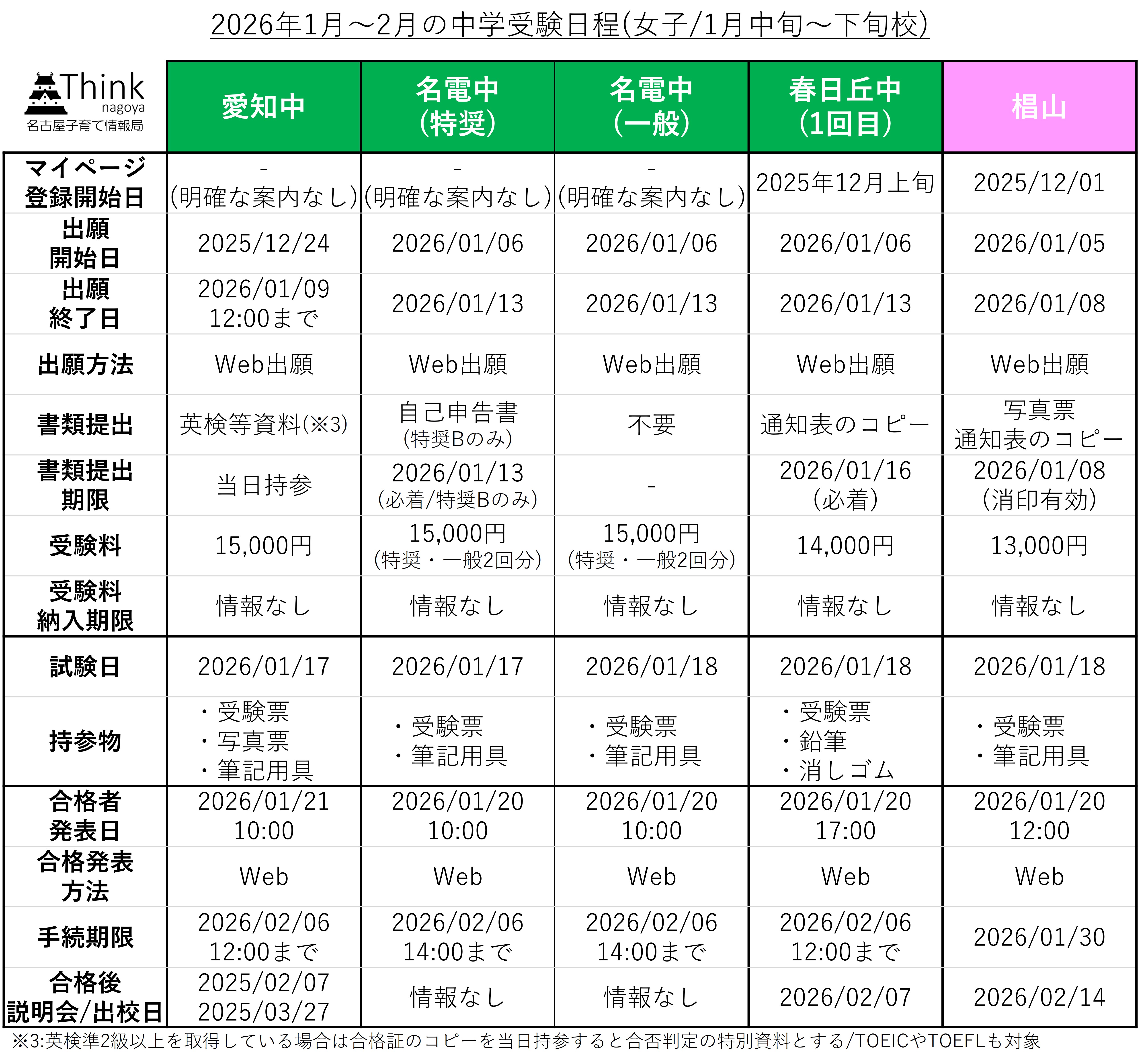 1月中旬~下旬受験校(共学3校(愛知・名電・春日丘)&椙山)