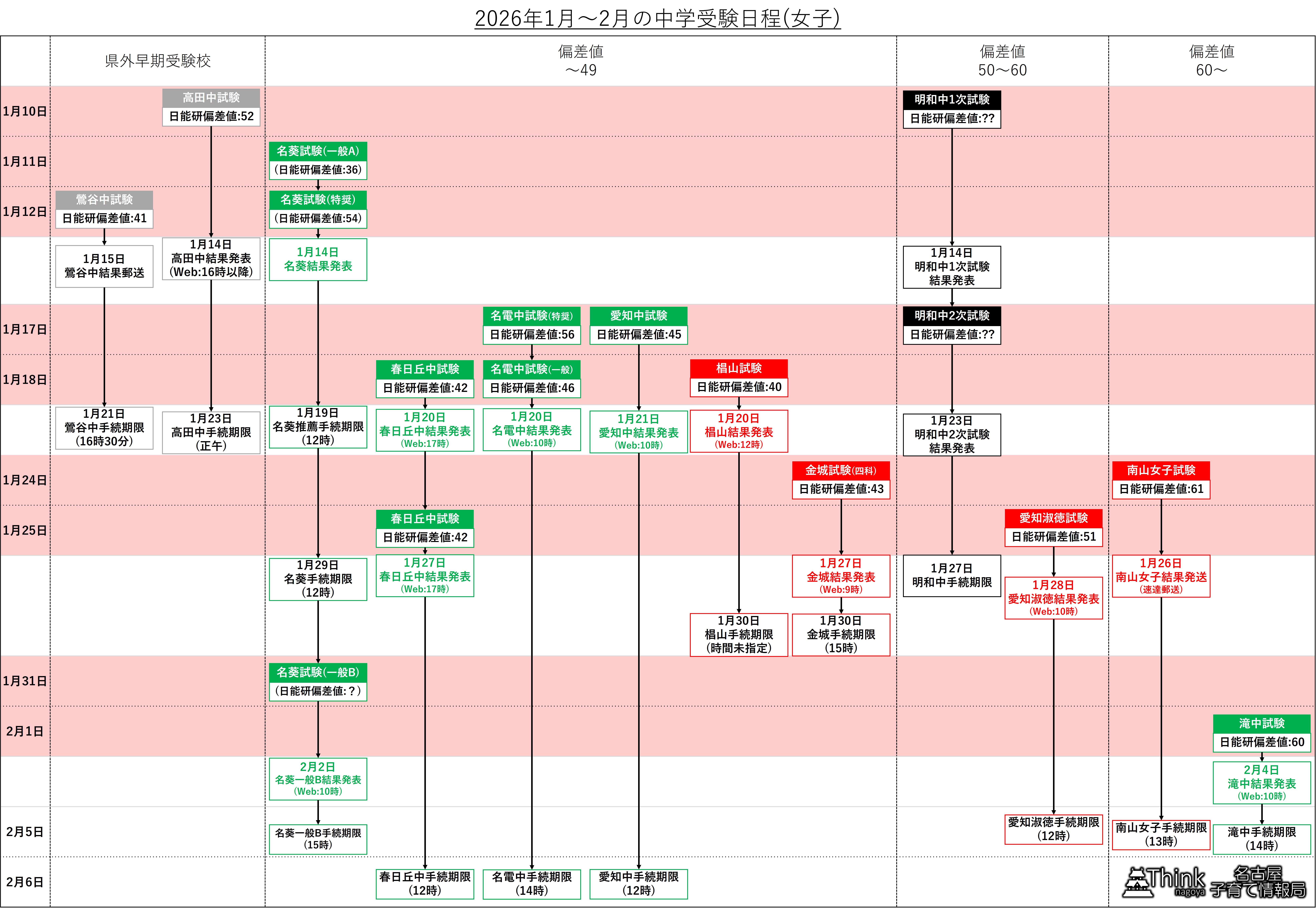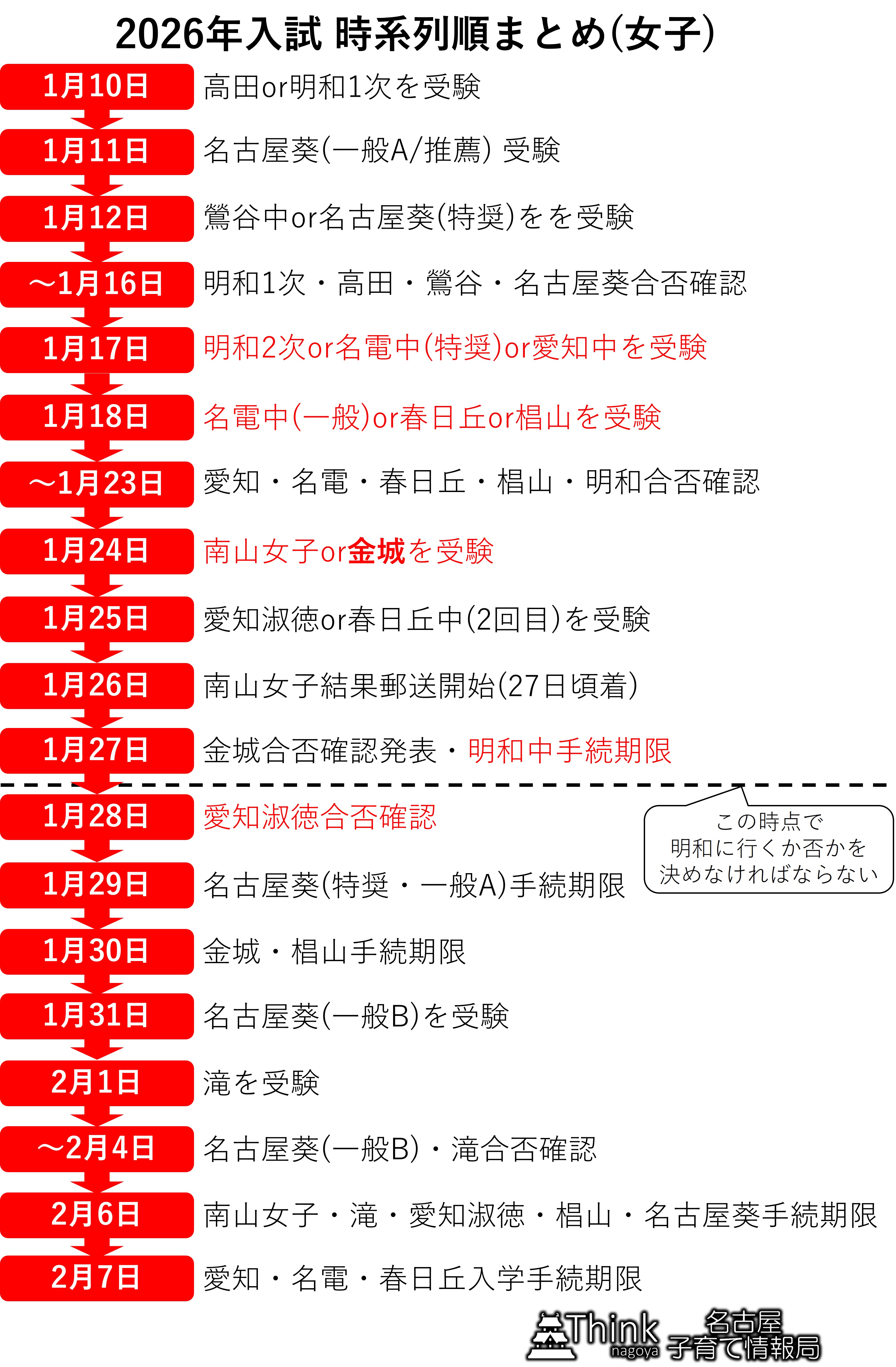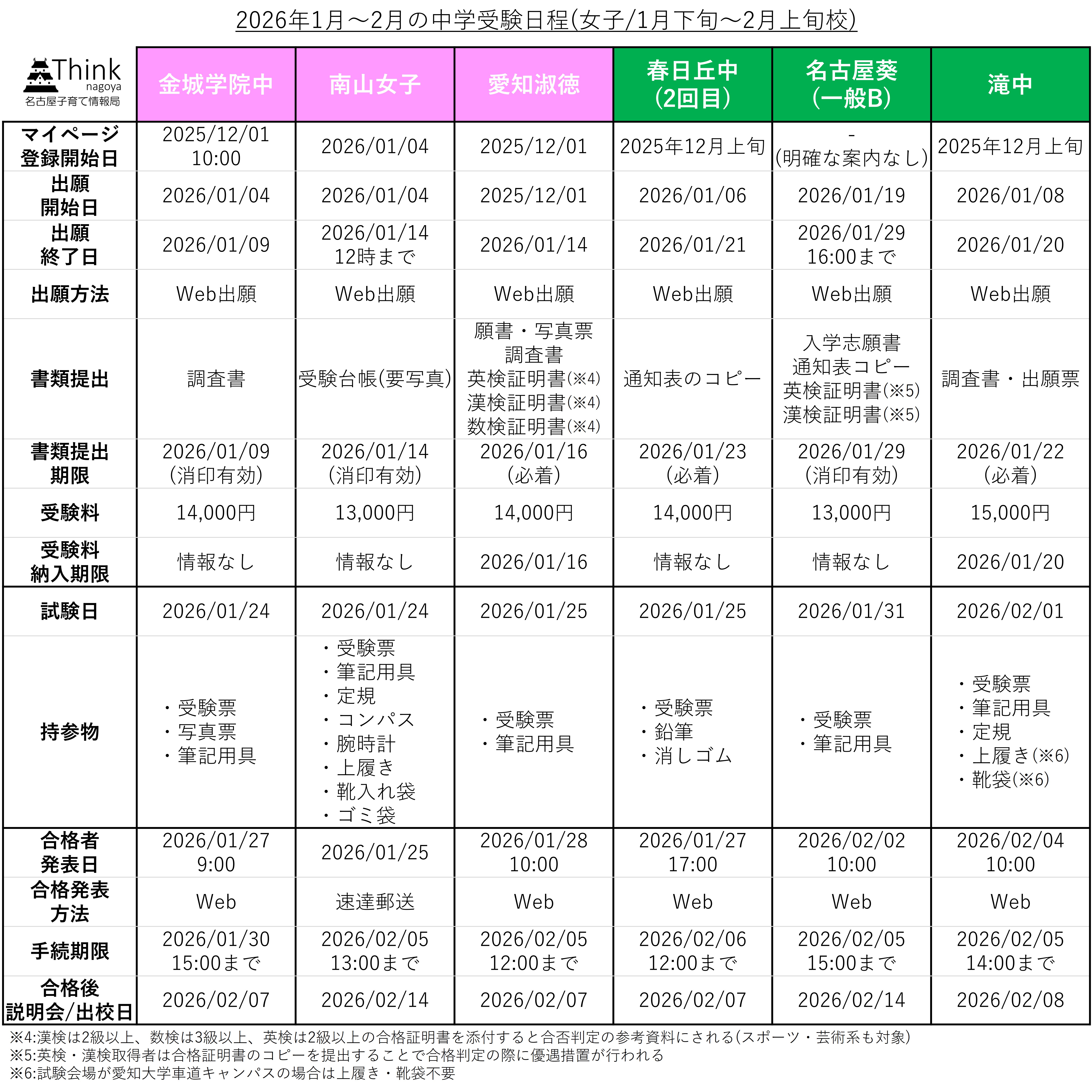 時期は東海地区の中学受験でメインとなる学校が多く、愛知淑徳・南山女子・滝中の難関校3校と、金城および春日丘の2回目があります。