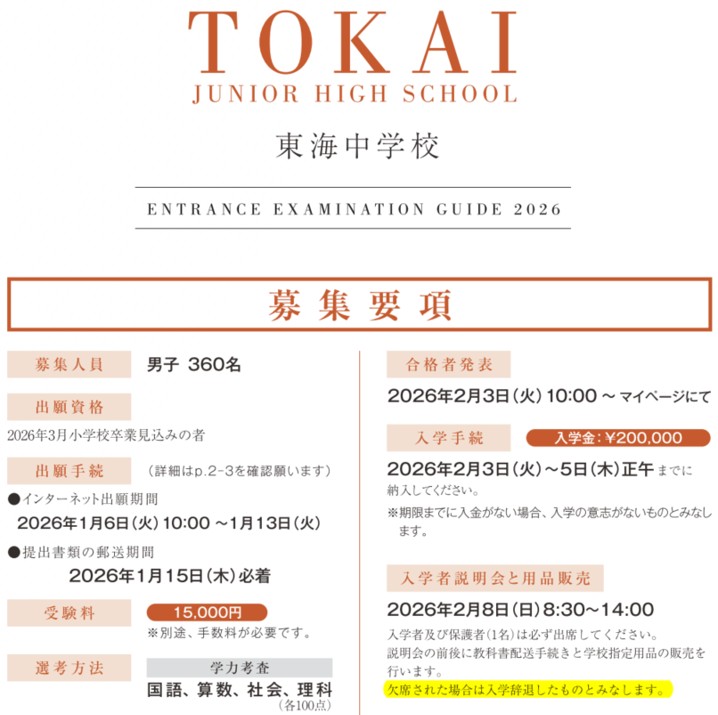 引用元:2026年東海中募集要項より抜粋