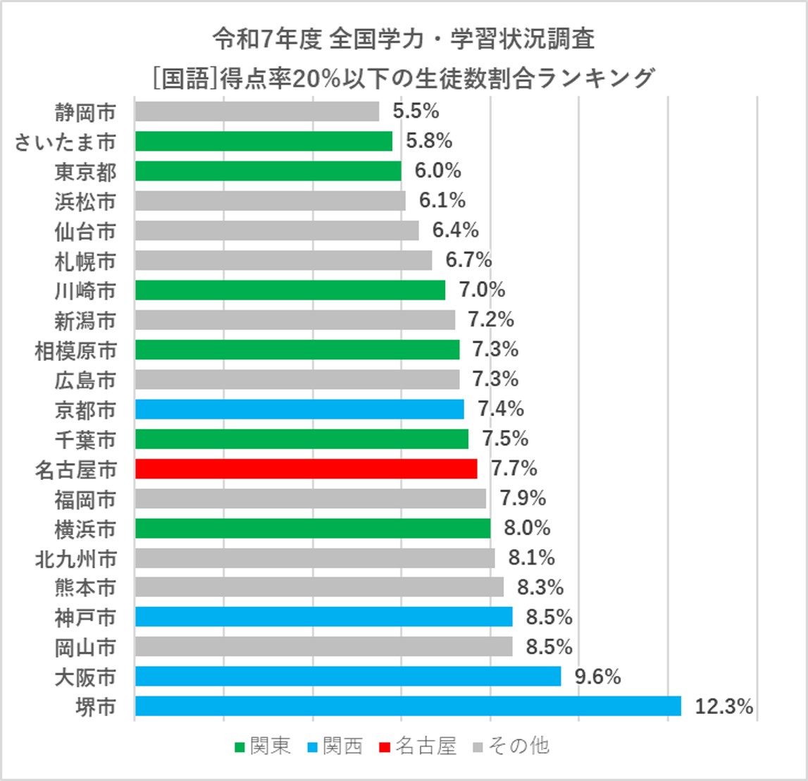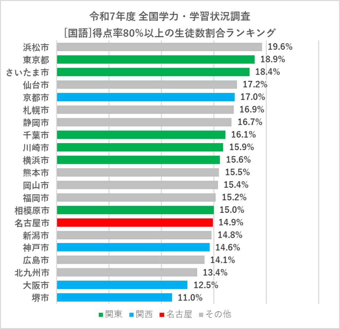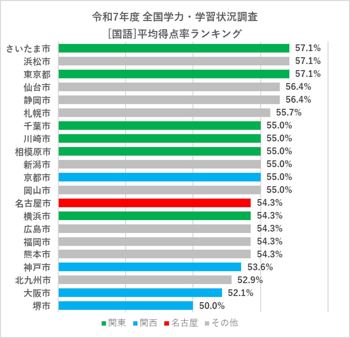 上記の通り、全体感としては、名古屋市の国語の学力は政令指定都市でも下位(13位)に来ています。