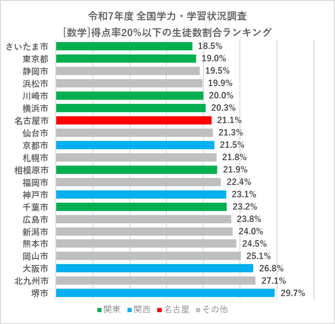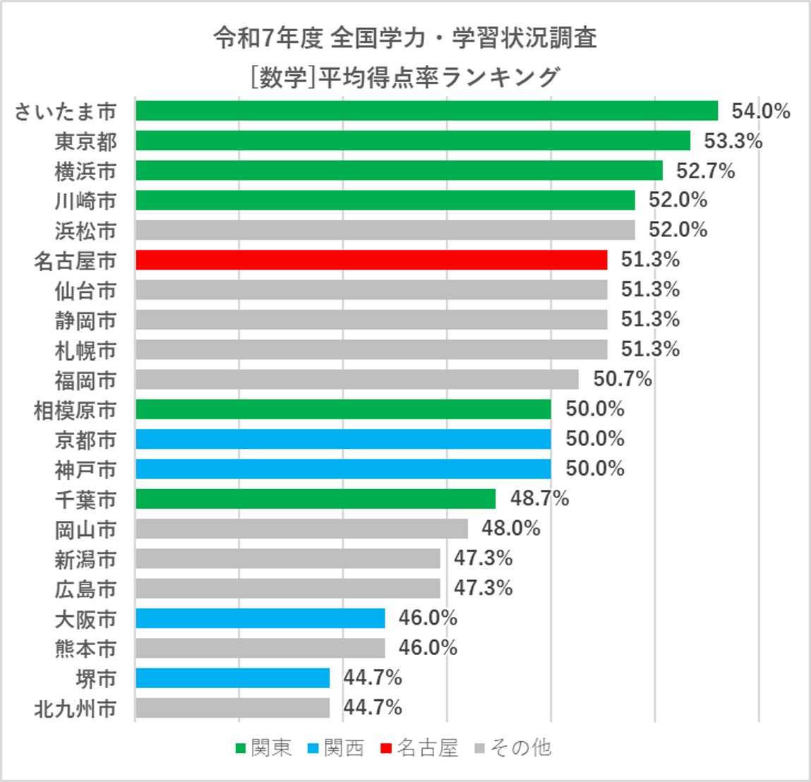 こちらは、国語とは大きく異なる結果で、名古屋市は6位に入っています。
