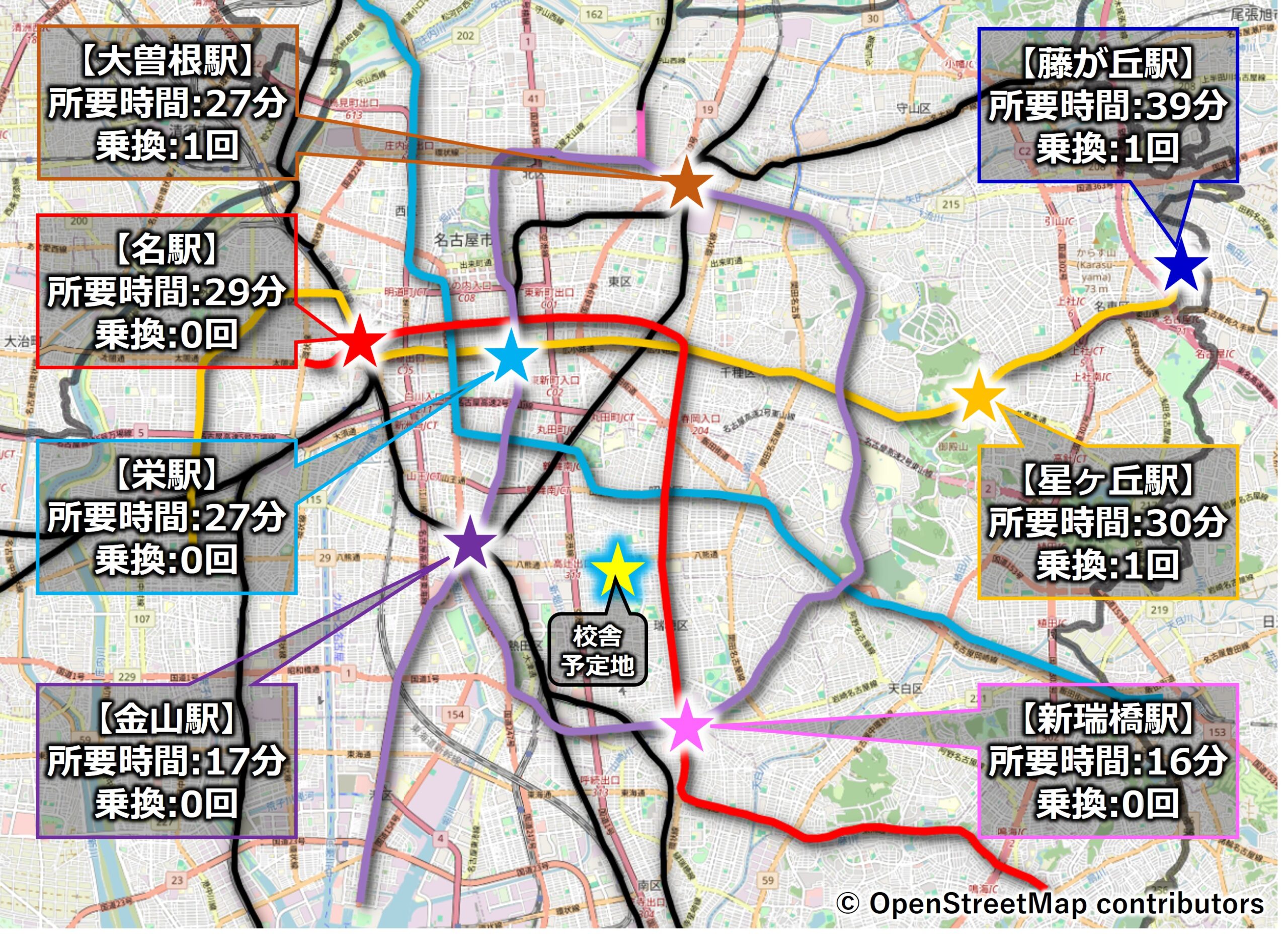 の7駅から名古屋市立大学滝子キャンパスまでの所要時間を調べてみました。