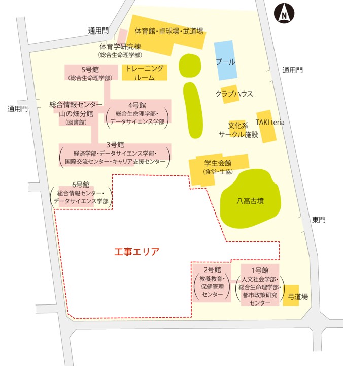 - 新棟建設中の学部(マップ内の「工事エリア」に建設中)