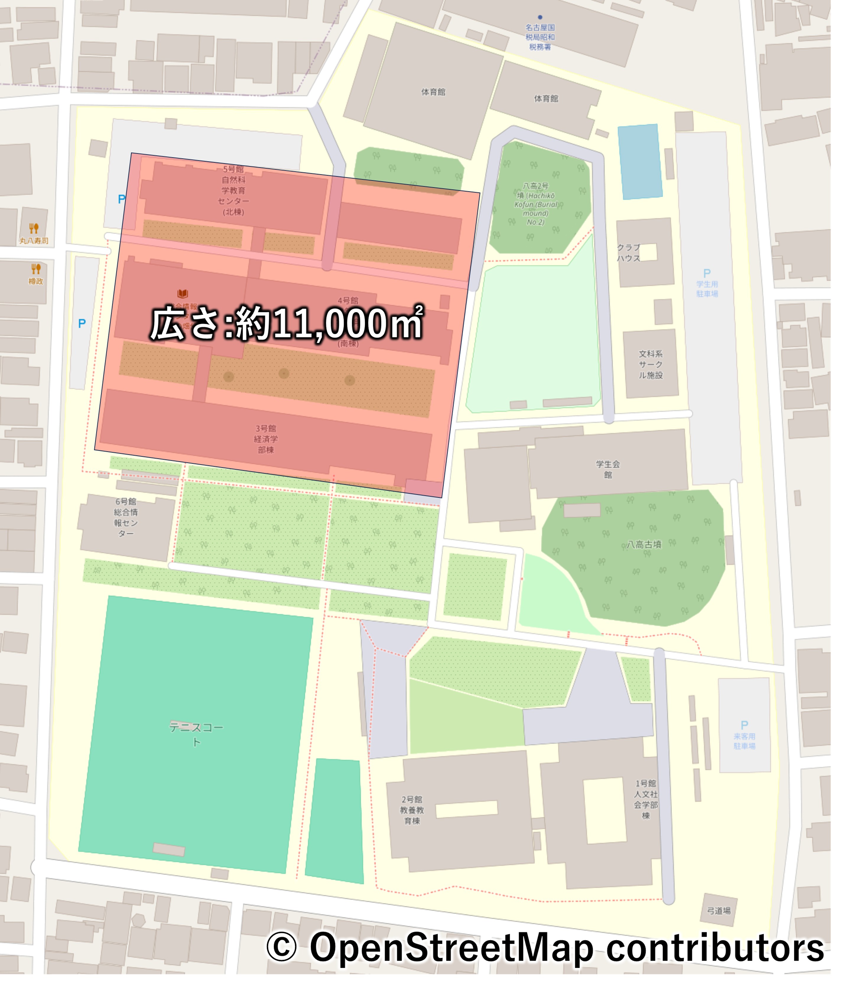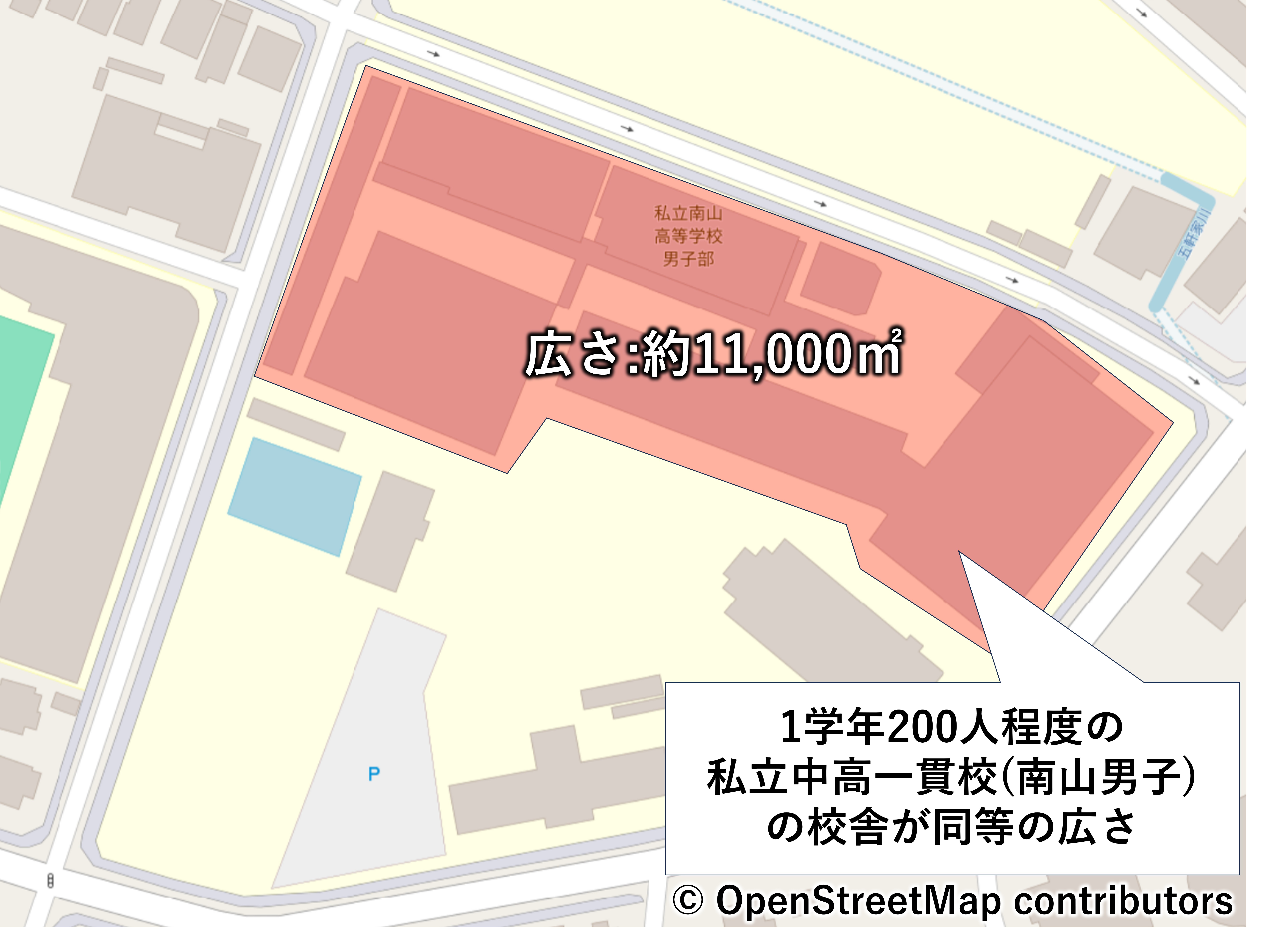 面積だけ言われても分かり辛いと思いますが、例えば、私立の1学年200人程度の学校(南山男子)の校舎の広さと同程度だと言えば、なんとなくイメージが伝わるでしょうか。