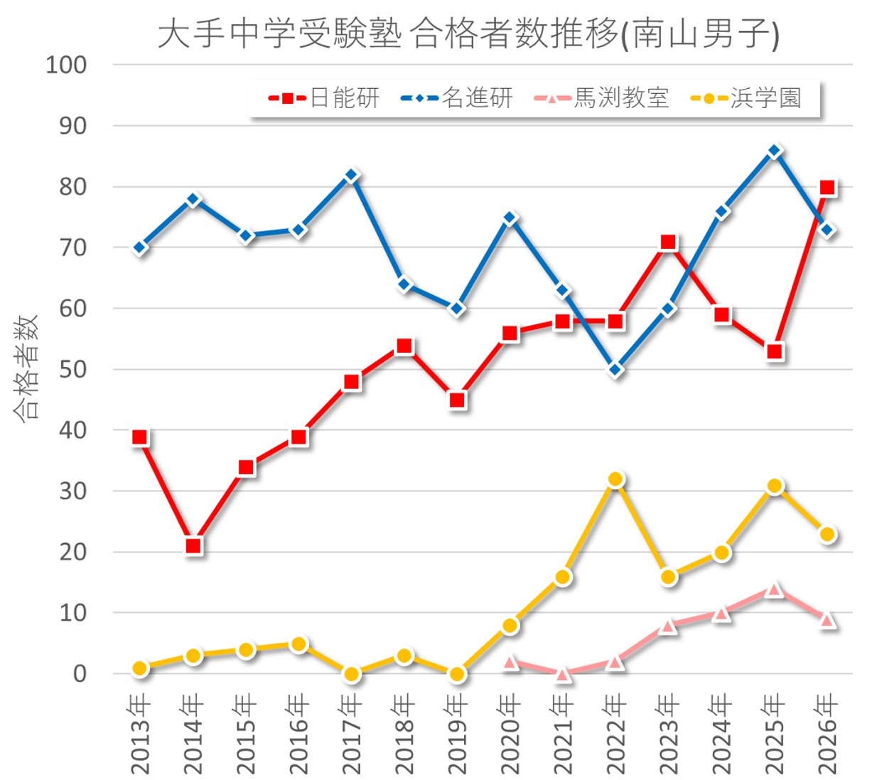 - 名進研・浜学園・馬渕教室が合格数を減らしており、特に馬渕教室と浜学園の減少率が高い