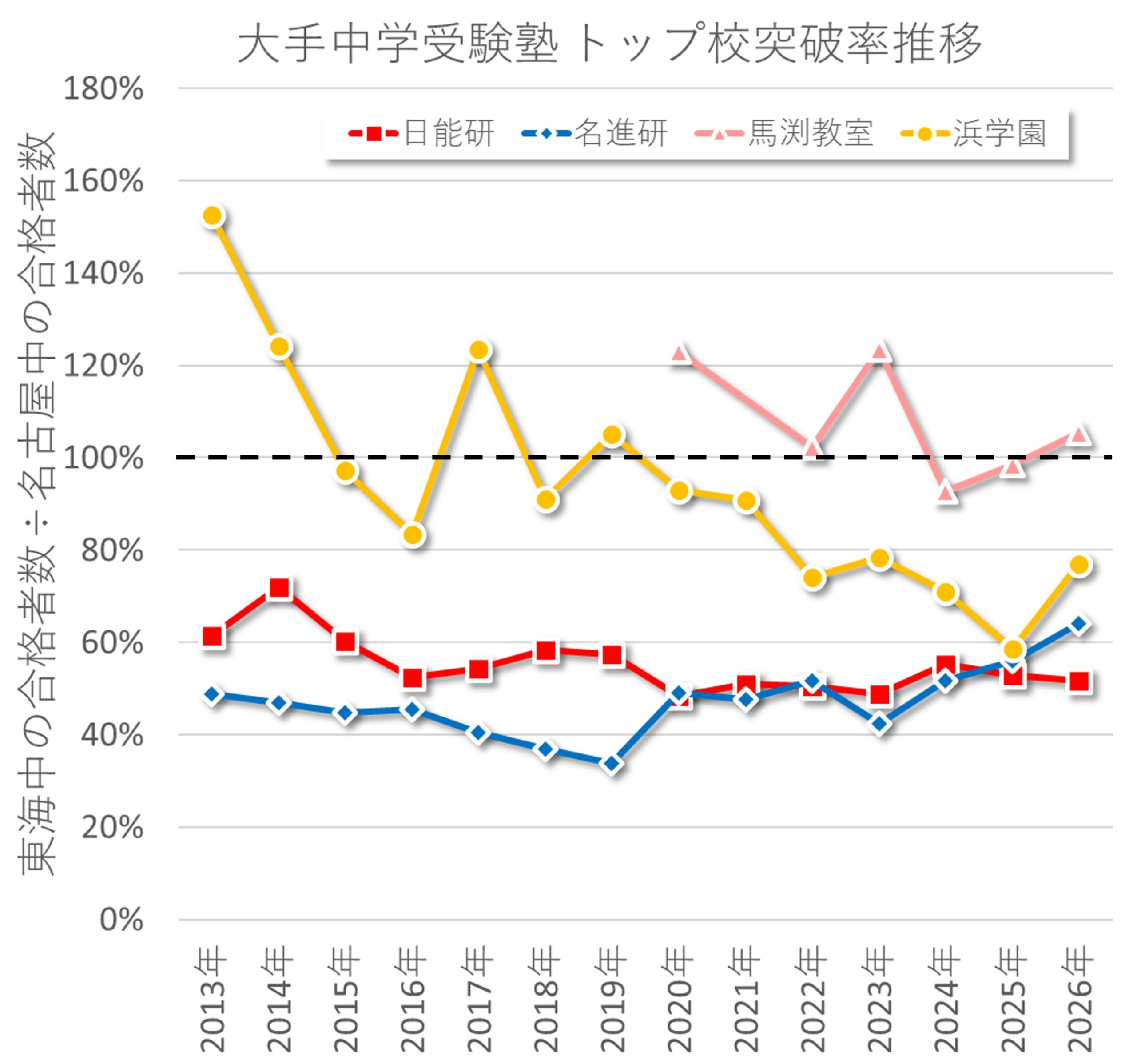 - 近年は日能研・名進研・浜学園は概ね60%弱に収束している