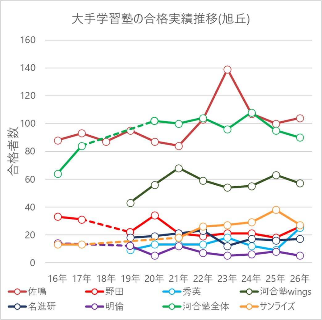 旭丘では数字を伸ばせませんでしたが、河合塾は明和では順調に合格数を伸ばしています。