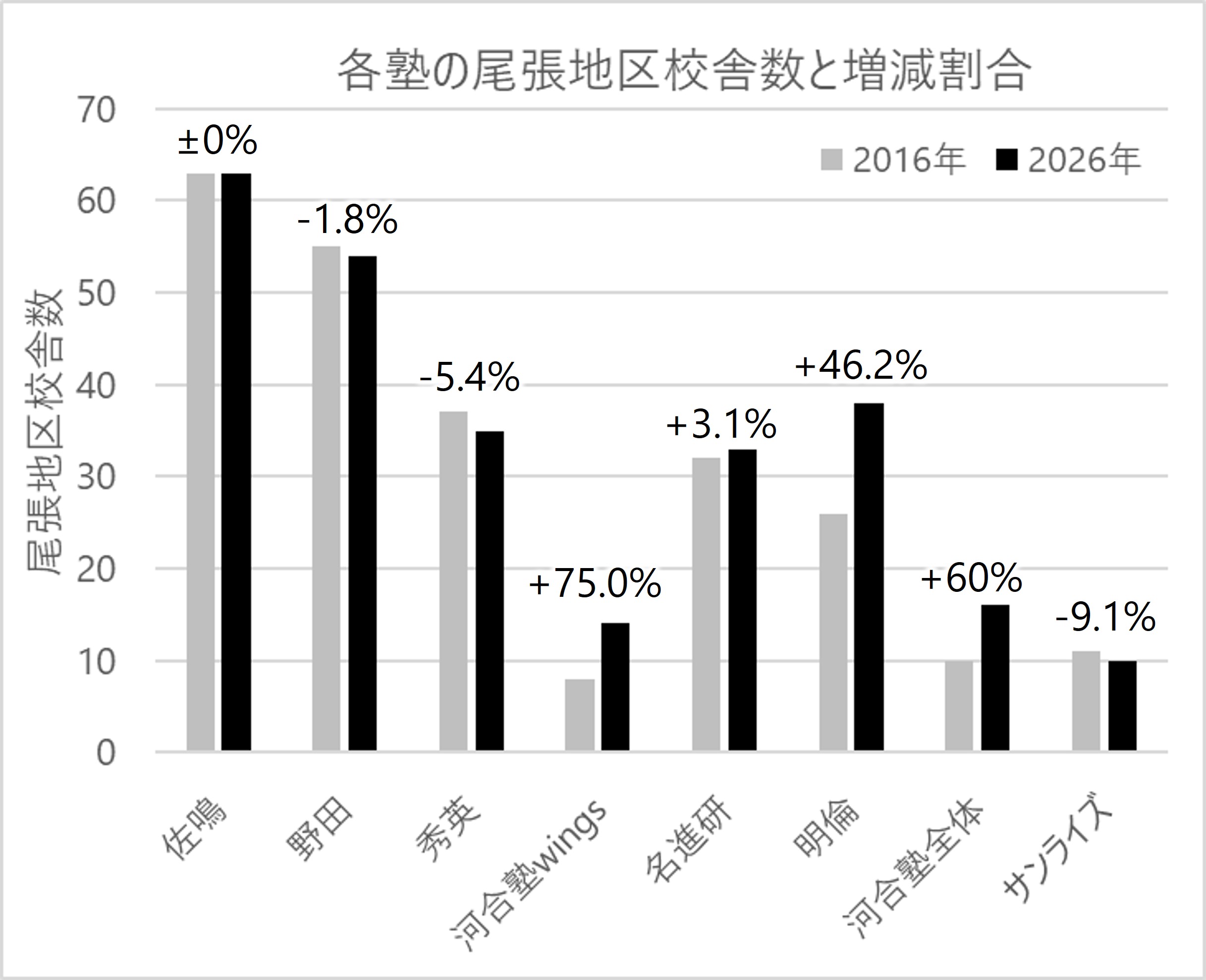 参考程度ですが、2016年と2026年(3月時点)の各塾の尾張地区における高校受験対応校舎数は以下の通りになっていました。
