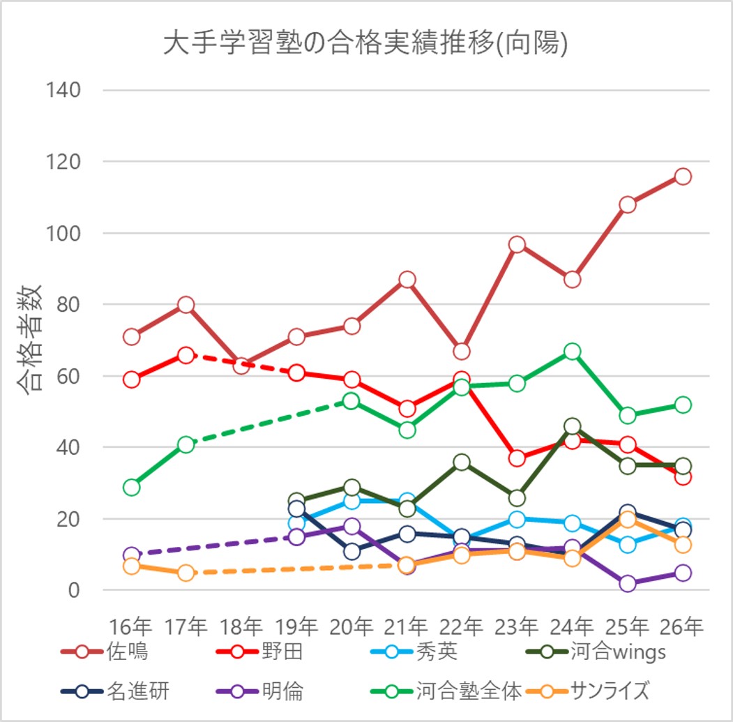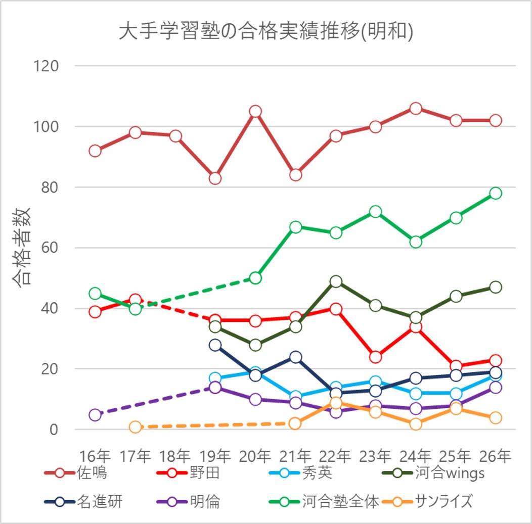 長期目線で見ると、河合塾が大きく伸びている反面、野田塾はかつては河合塾と競えるほどの実績を残していましたが、現在は名進研や秀英予備校とあまり変わらない実績になっているのが目立ちますね。