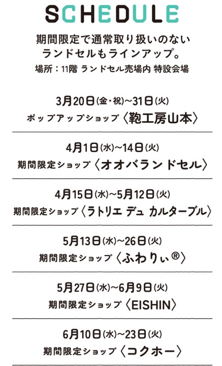 なお、2026年5月27日~2026年5月31日は「ランドセルフェスティバル」として4階に特設会場を設置して600点以上のランドセルを展示するとのこと。